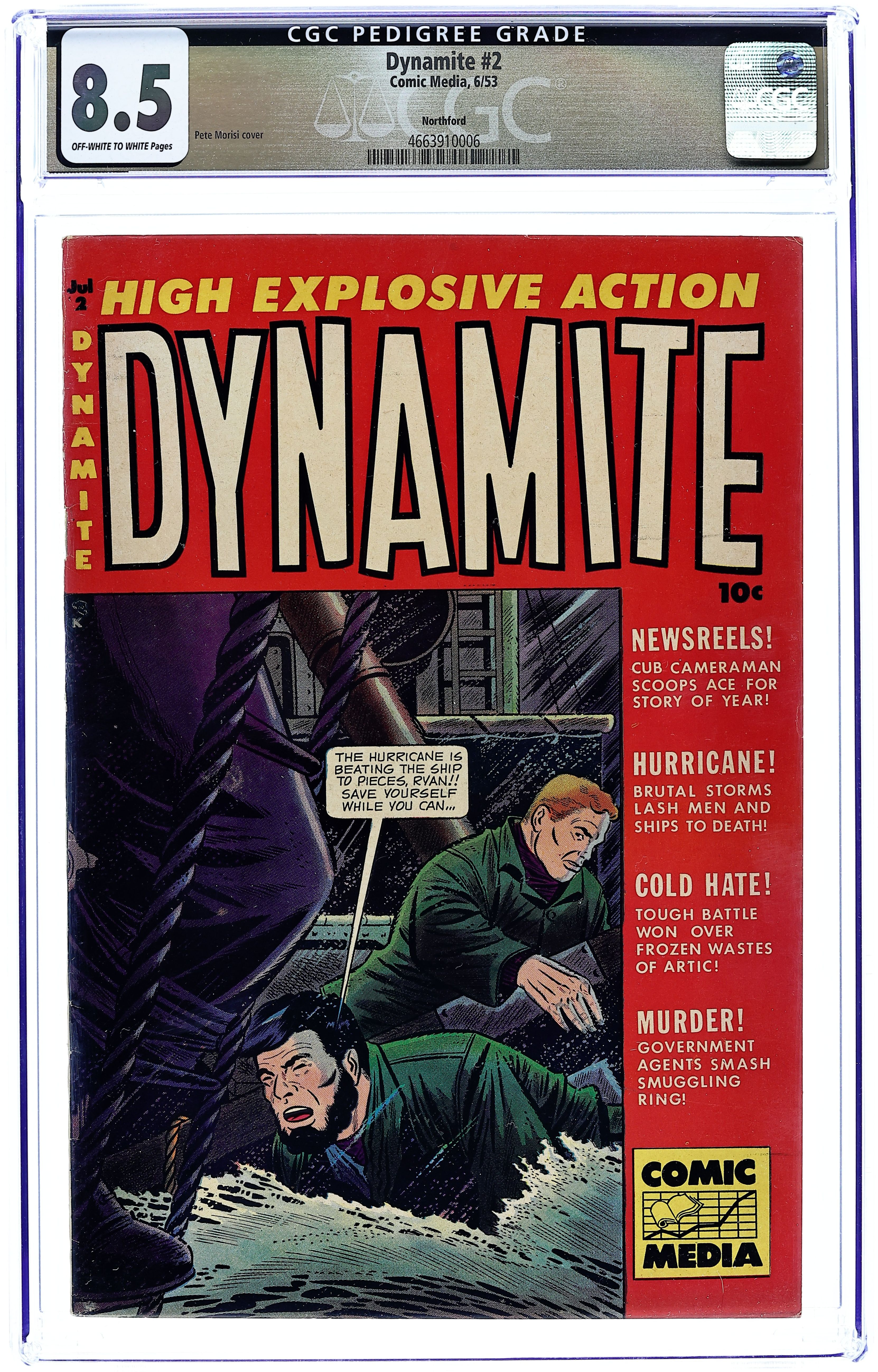 Cover by Pete Morisi. Stories and art by Don Heck, Edwin Green and Pete Morisi. Men's adventure comics that served as a platform to launch one-eyed private eye Johnny Dynamite. Top newsreel reporter Ace tries to find out how a cub reporter scooped him on the story of the year. Sailors attempt to weather a brutal hurricane. Government agents track murderous smugglers to their lair. Art and a cover by future Marvel legend Don Heck. Newsreels; Hurricane; Devil Deal; Cold Hate; Murder. 32 pages, Full Color. Cover price $0.10.