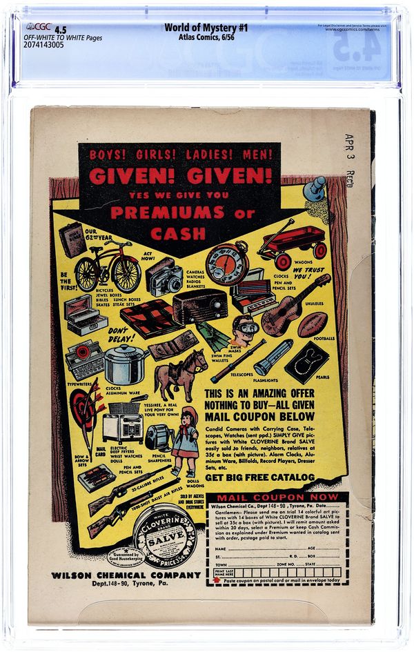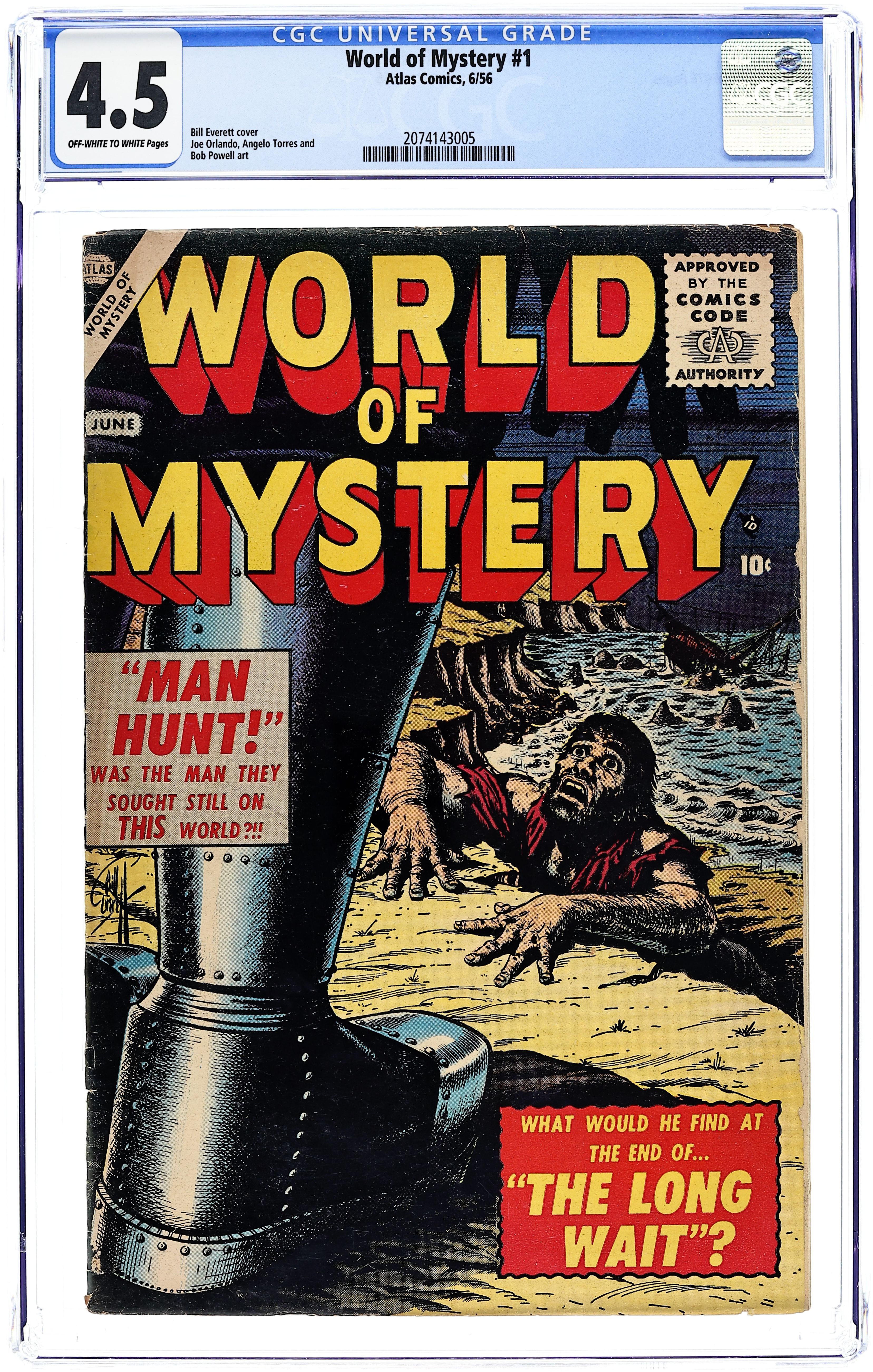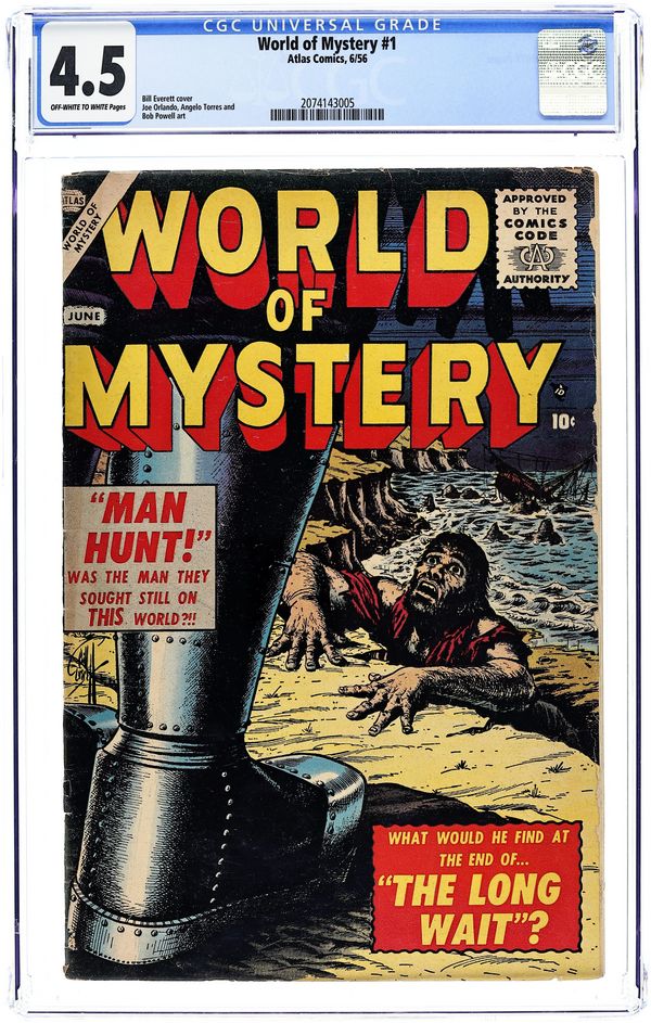 "The Metal Men" (art by Angelo Torres), "I Am Your Master," "Man Hunt" (art by Bob Powell), "When the Clock Stops," "The Long Wait," "Mission to Earth" (art by Joe Orlando), and a two-page text story, "The Inventor." Bill Everett cover. Cover price $0.10.