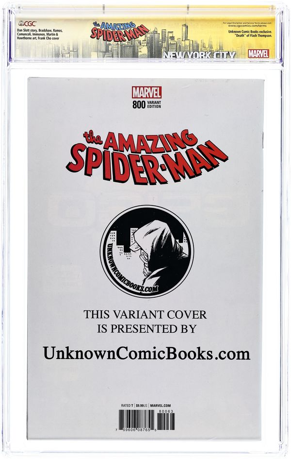 Unknown Comics exclusive virgin cover by Frank Cho. Go Down Swinging: Part 4 of 4 - Written by Dan Slott. Art by Nick Bradshaw, Humberto Ramos, Guiseppe Camuconli, Stuart Immonen, Marcos Martin, Victor Olazaba, Cam Smith and Wade Von Grawbadger. Dan Slott and Stuart Immomen are joined by many of the artists who made the last 10 years of Spider-Man so Amazing! The biggest Peter Parker/Norman Osborn story of all time unfolds over one 80-page story, a scope unmatched in comics! Who lives?! Who dies?! And what scars will Spider-Man bear from here on out?! 92 pages,full color. Rated T