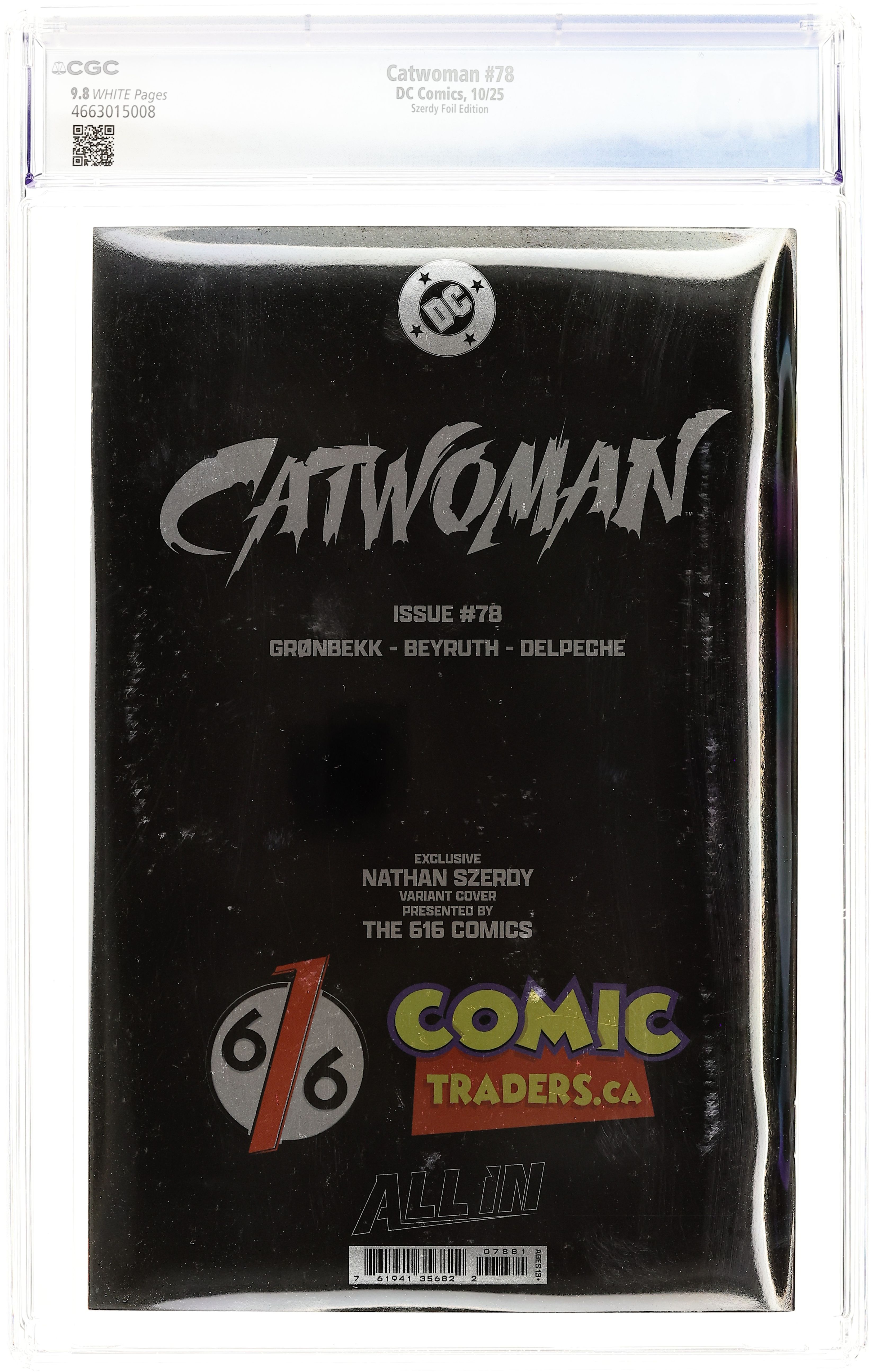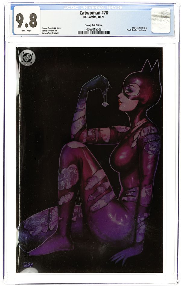 The 616 Comics and Comic Traders Exclusive Foil Edition Virgin Cover by Nathan Szerdy. Written by Torunn Gronbekk. Art by Danilo Beyruth. THE CONTRACT ON CATWOMAN'S LIFE CLOSES! It's all been leading up to this! Selina is finally face-to-face with the mysterious enemy trying to bury her six feet under. Will the feline femme fatale find a way out of this predicament, or is it curtains for the cat criminal?! Find out in this special oversize issue! And don't say we didn't warn you when the rug gets pulled out from under you! 40 pages, full color. Rated T+