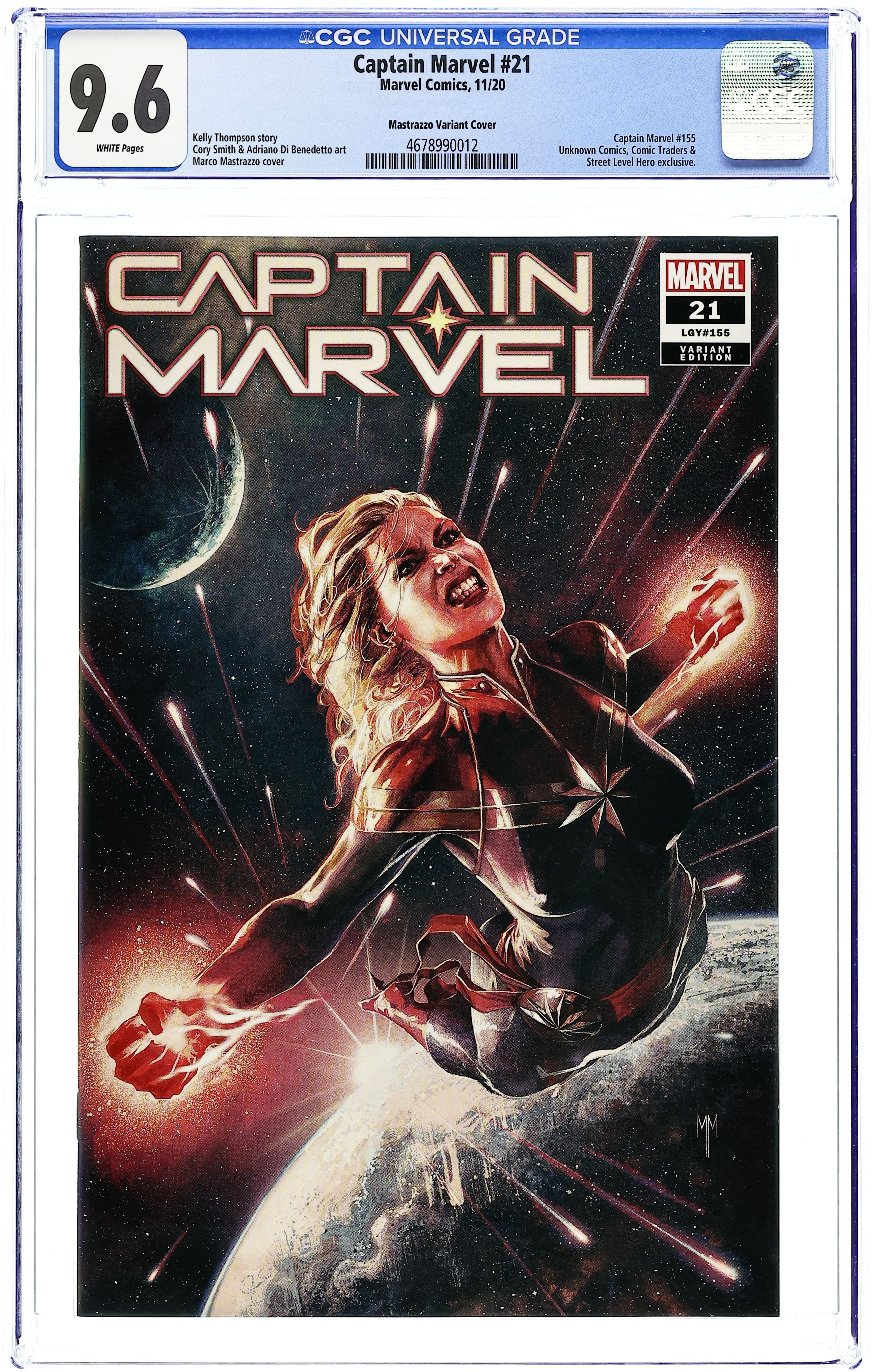 Comics Illuminati (Unknown Comics, Street Level Hero, and Comic Traders) Exclusive Virgin Cover by Marco Mastrazzo. Written by Kelly Thompson. Art by Cory Smith. EMPYRE Tie-In! A CAPTAIN'S LEGACY - THE ACCUSED FINALE! The rise and fall of the Supreme Accuser. The end of a war, the end of an ERA…and the birth of an even more dangerous world. Carol Danvers must make a choice that will define her life and the lives of those closest to her. 28 pages, full color. Rated T+