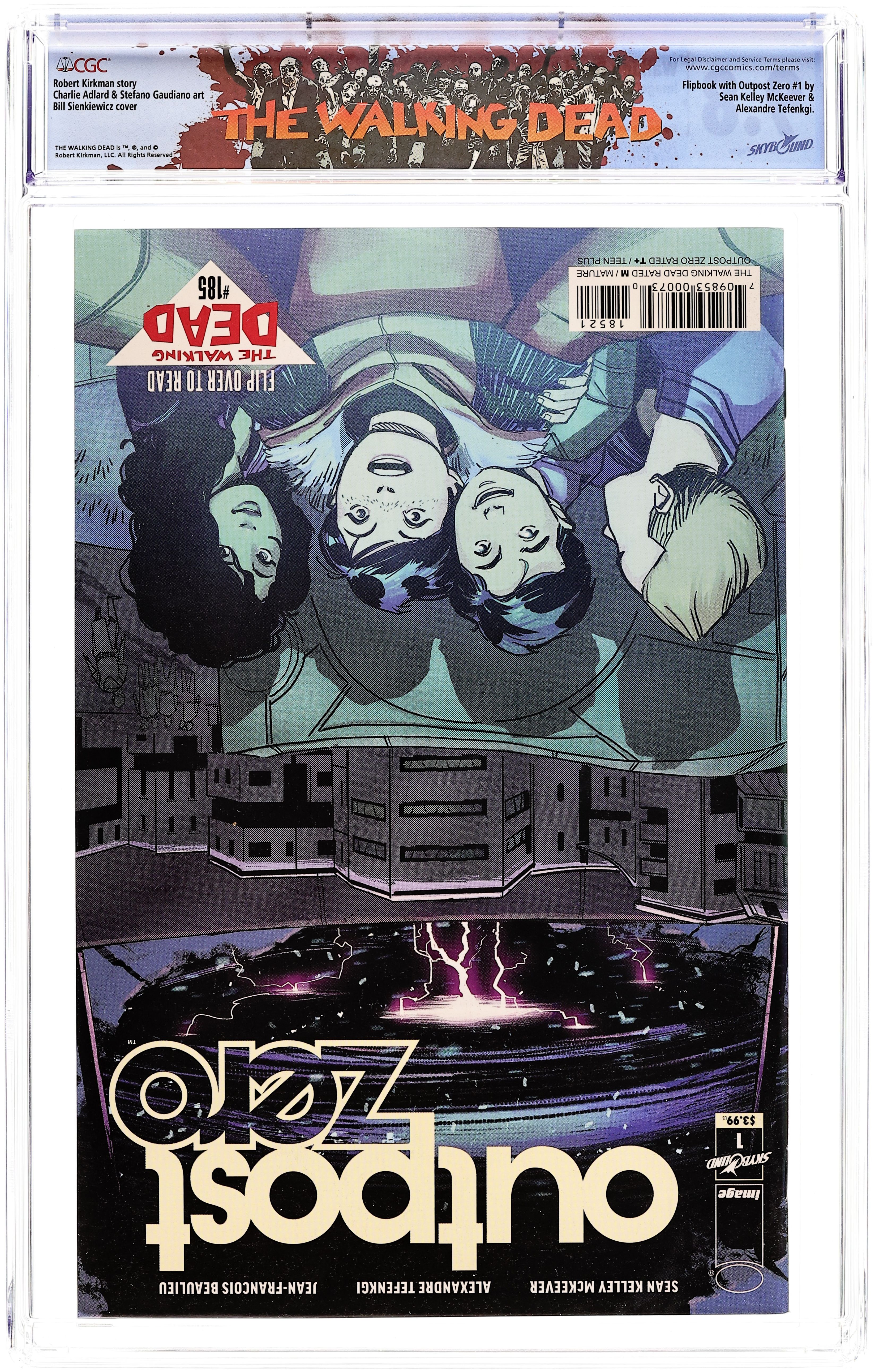 Written by Robert Kirkman. Art by Charlie Adlard, Stefano Gaudiano and Cliff Rathburn. Cover by Bill Sienkiewicz. On guard. Things are quiet at the Hilltop, but there is a storm brewing on the horizon. Flipbook contains Outpost Zero #1. 52 pages, PC/PB&W. Rated M Cover price $3.99.