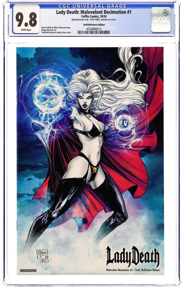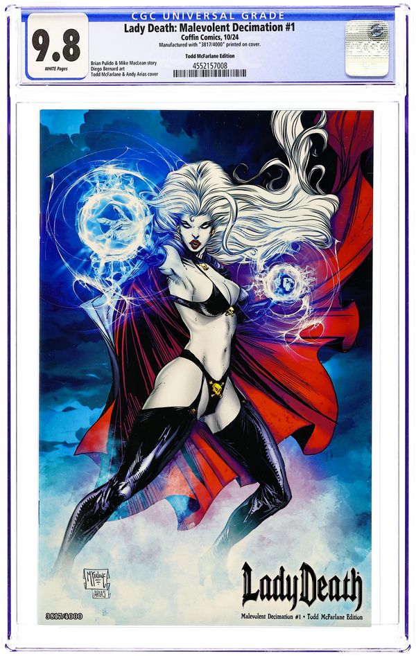 Todd McFarlane Edition Variant Cover by Todd McFarlane and Andy Arias - limited to 4000 copies. Written by Brian Pulido, Mike MacLean. Art by Diego Bernard. Lady Death has always been the BAD GIRL. But once upon a time, she was absolutely EVIL. Obsessed with annihilation, the diva of death sought to snuff out the entire human race and turn the earth into an endless graveyard. Thankfully, Lady Death changed her wicked ways to become a champion of the downtrodden and a scourge of demon-kind throughout Hell. For generations, the evil seething within the witch's soul lied dormant....forgotten...until now! Something has awakened-a sinister passion that leads Lady Death to the darkest corners of the globe. Leaving piles of bloody bodies in her wake, she seeks a mysterious power never before seen by mankind. But for what nefarious purpose? Featuring the key first appearance of the newest Coffinverse characters: Devilock, Demon hunter Muuaji and the hoodoo princess Madam Midnight. Also guest starring La Muerta! 32 pages, full color.