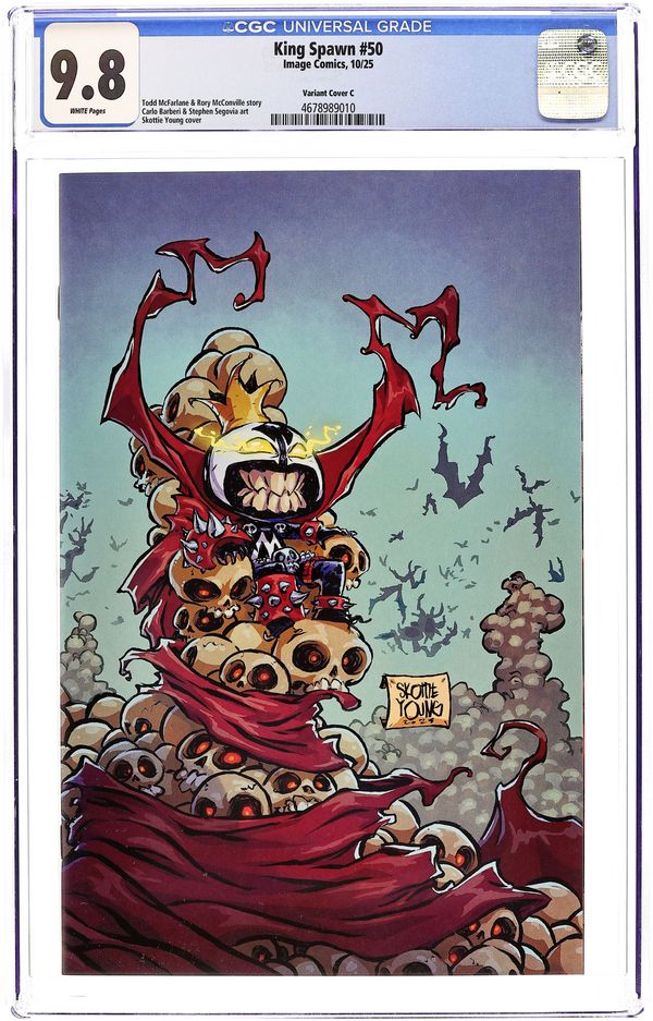 Ends Feb 23 8:31 PM CST Bid History 4 bids Current Bid $23 Your Secret Max Bid If you'd like to bid, please log in or register. (W) Rory McConville, Todd McFarlane (A) Stephen Segovia, Carlo Barberi (CA) Skottie Young Four years ago, Todd McFarlane launched the first large-scale expansion of the Spawn Universe with King Spawn #1. Now we are here to celebrate the success of the expanded Spawn's Universe with King Spawn #50. An oversized issue with a story that will cross over into all three of the #50's coming out in the coming months. (King Spawn, Gunslinger Spawn, The Scorched). An ancient force, almost as old as time itself, has returned, and Spawn is in its sights. The story, sent into two chapters per issue, will be penciled by two of the Spawn Universe's best, Stephen Segovia and Carlo Barberi. This is the one you don't want to miss. Featuring covers by Todd McFarlane, Puppeteer Lee connecting cover), and Mark Spears. 32 pages, full color, not rated. Cover price $4.99.