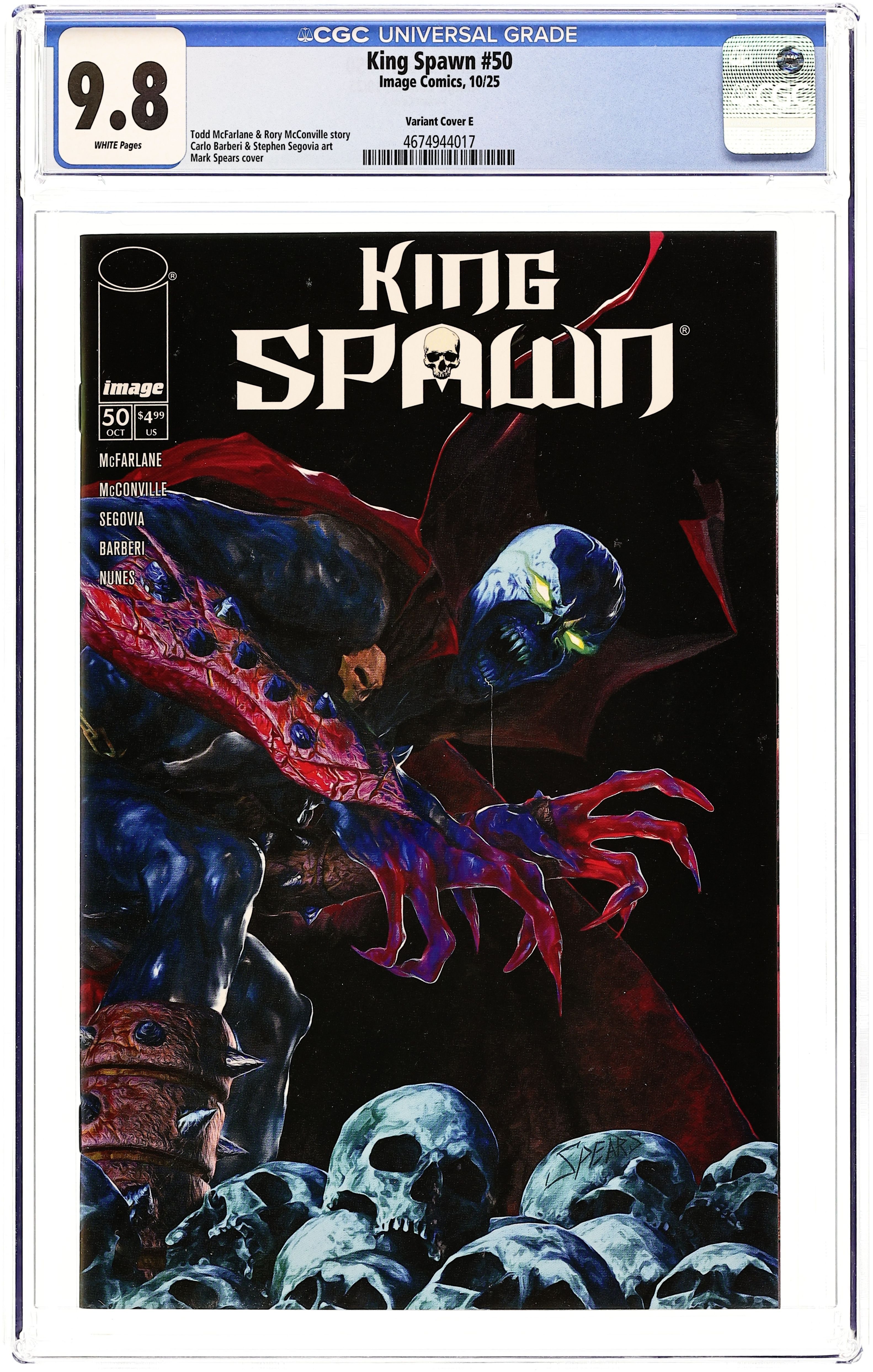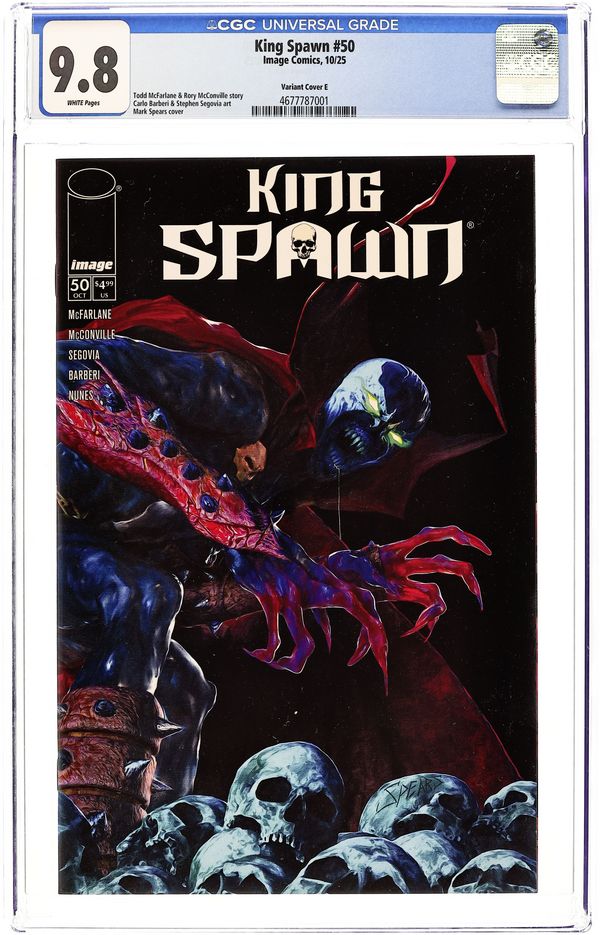 Limited 1 for 50 Retailer Incentive Variant Cover. (W) Rory McConville, Todd McFarlane (A) Stephen Segovia, Carlo Barberi (CA) Mark Spears Four years ago, Todd McFarlane launched the first large-scale expansion of the Spawn Universe with King Spawn #1. Now we are here to celebrate the success of the expanded Spawn's Universe with King Spawn #50. An oversized issue with a story that will cross over into all three of the #50's coming out in the coming months. (King Spawn, Gunslinger Spawn, The Scorched). An ancient force, almost as old as time itself, has returned, and Spawn is in its sights. The story, sent into two chapters per issue, will be penciled by two of the Spawn Universe's best, Stephen Segovia and Carlo Barberi. Cover price $4.99.