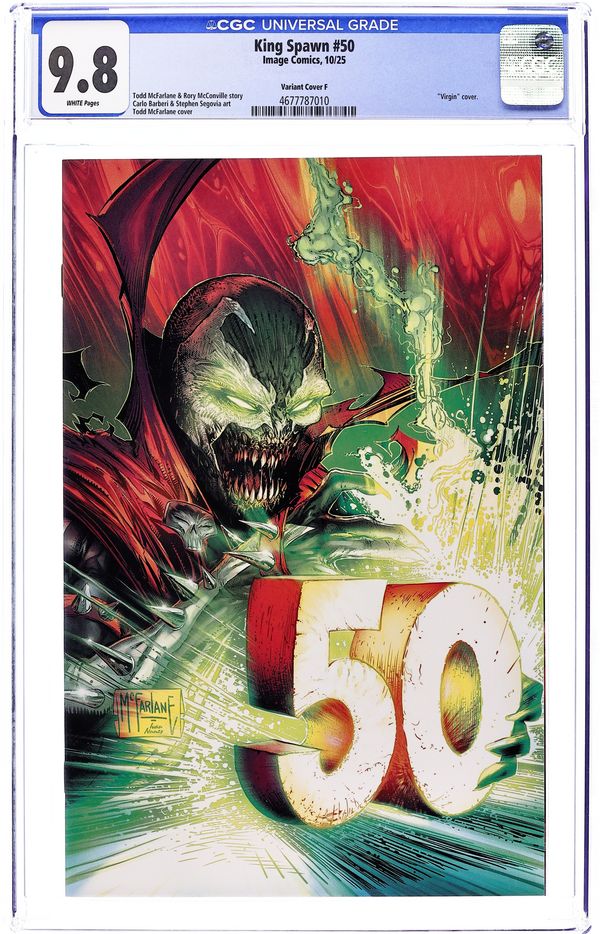 Ends Feb 23 8:31 PM CST Bid History 3 bids Current Bid $16 Your Secret Max Bid If you'd like to bid, please log in or register. Limited 1 for 50 Retailer Incentive Variant Cover. (W) Rory McConville, Todd McFarlane (A) Stephen Segovia, Carlo Barberi (CA) Mark Spears Four years ago, Todd McFarlane launched the first large-scale expansion of the Spawn Universe with King Spawn #1. Now we are here to celebrate the success of the expanded Spawn's Universe with King Spawn #50. An oversized issue with a story that will cross over into all three of the #50's coming out in the coming months. (King Spawn, Gunslinger Spawn, The Scorched). An ancient force, almost as old as time itself, has returned, and Spawn is in its sights. The story, sent into two chapters per issue, will be penciled by two of the Spawn Universe's best, Stephen Segovia and Carlo Barberi. Cover price $4.99.