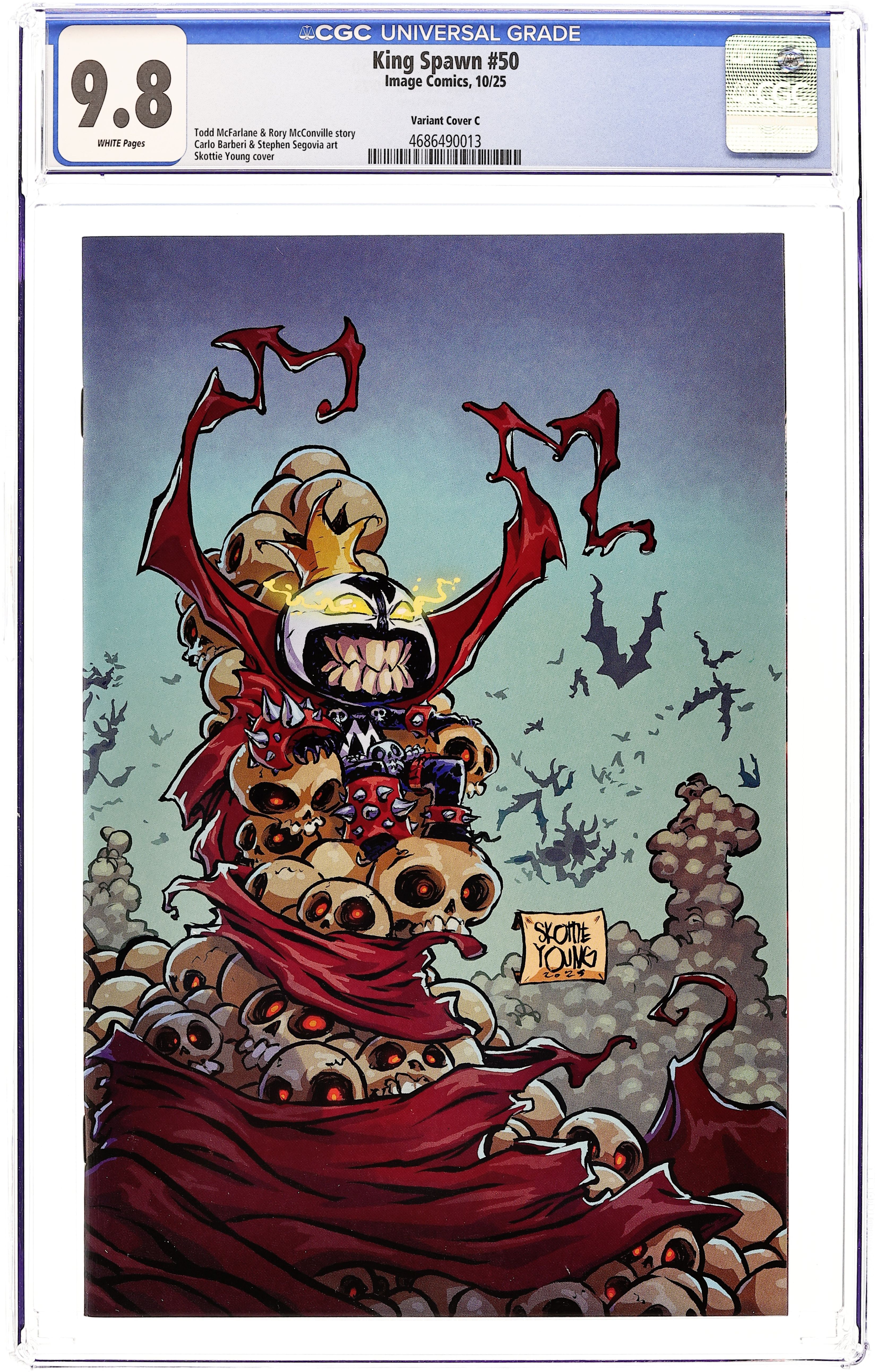 (W) Rory McConville, Todd McFarlane (A) Stephen Segovia, Carlo Barberi (CA) Skottie Young Four years ago, Todd McFarlane launched the first large-scale expansion of the Spawn Universe with King Spawn #1. Now we are here to celebrate the success of the expanded Spawn's Universe with King Spawn #50. An oversized issue with a story that will cross over into all three of the #50's coming out in the coming months. (King Spawn, Gunslinger Spawn, The Scorched). An ancient force, almost as old as time itself, has returned, and Spawn is in its sights. The story, sent into two chapters per issue, will be penciled by two of the Spawn Universe's best, Stephen Segovia and Carlo Barberi. This is the one you don't want to miss. Featuring covers by Todd McFarlane, Puppeteer Lee connecting cover), and Mark Spears. 32 pages, full color, not rated. Cover price $4.99.