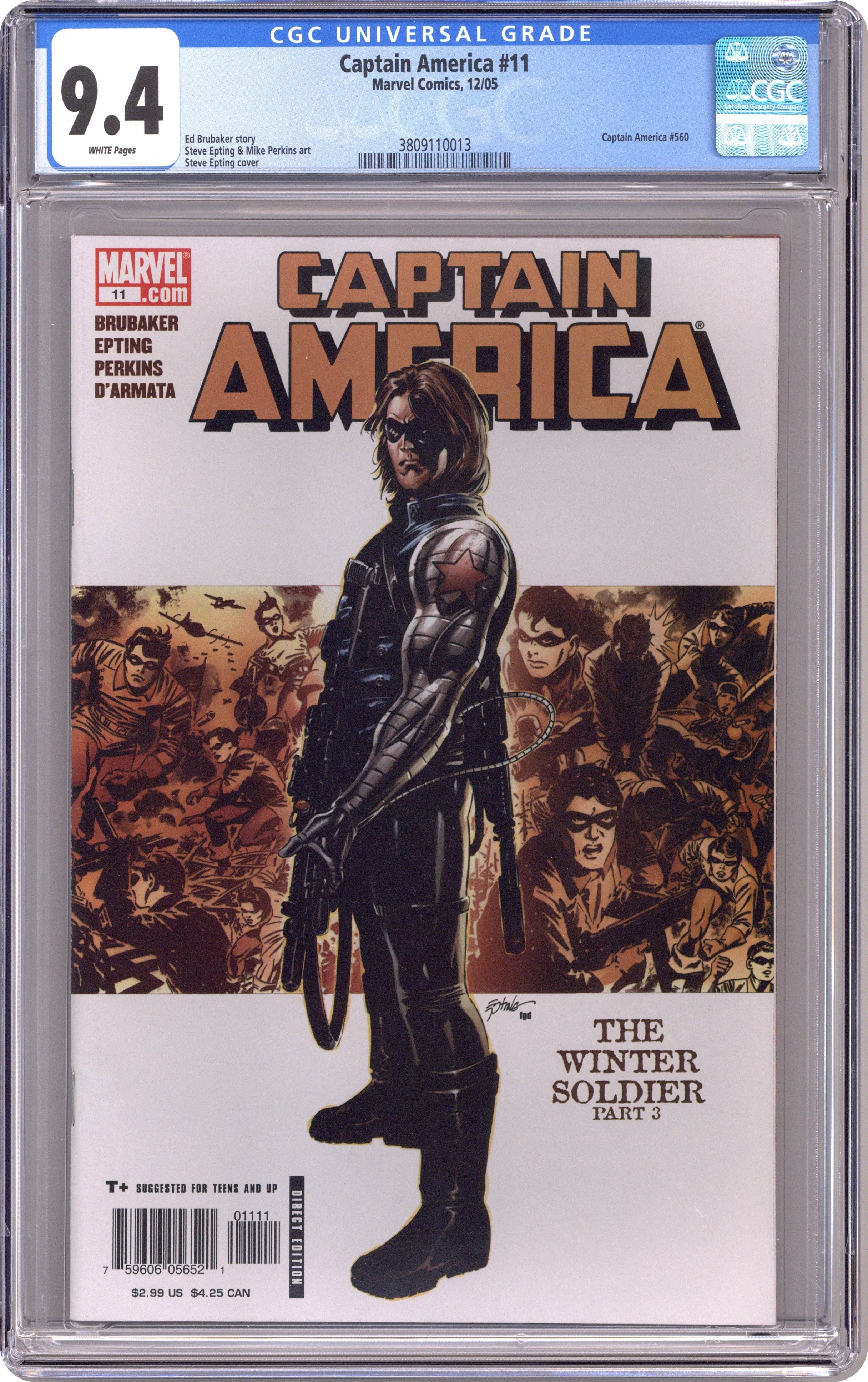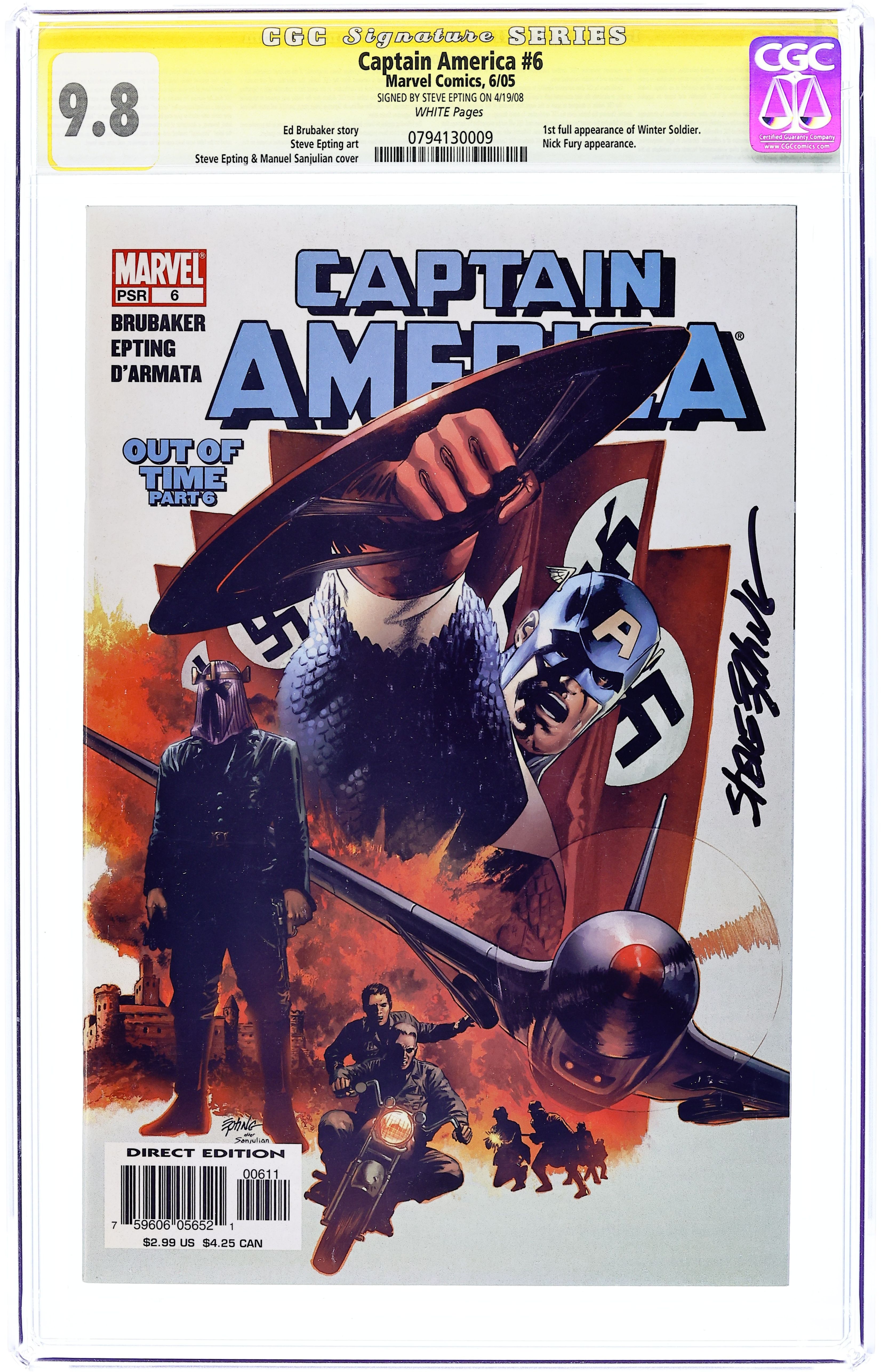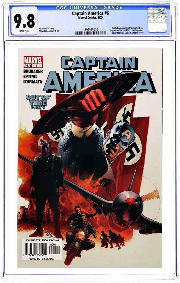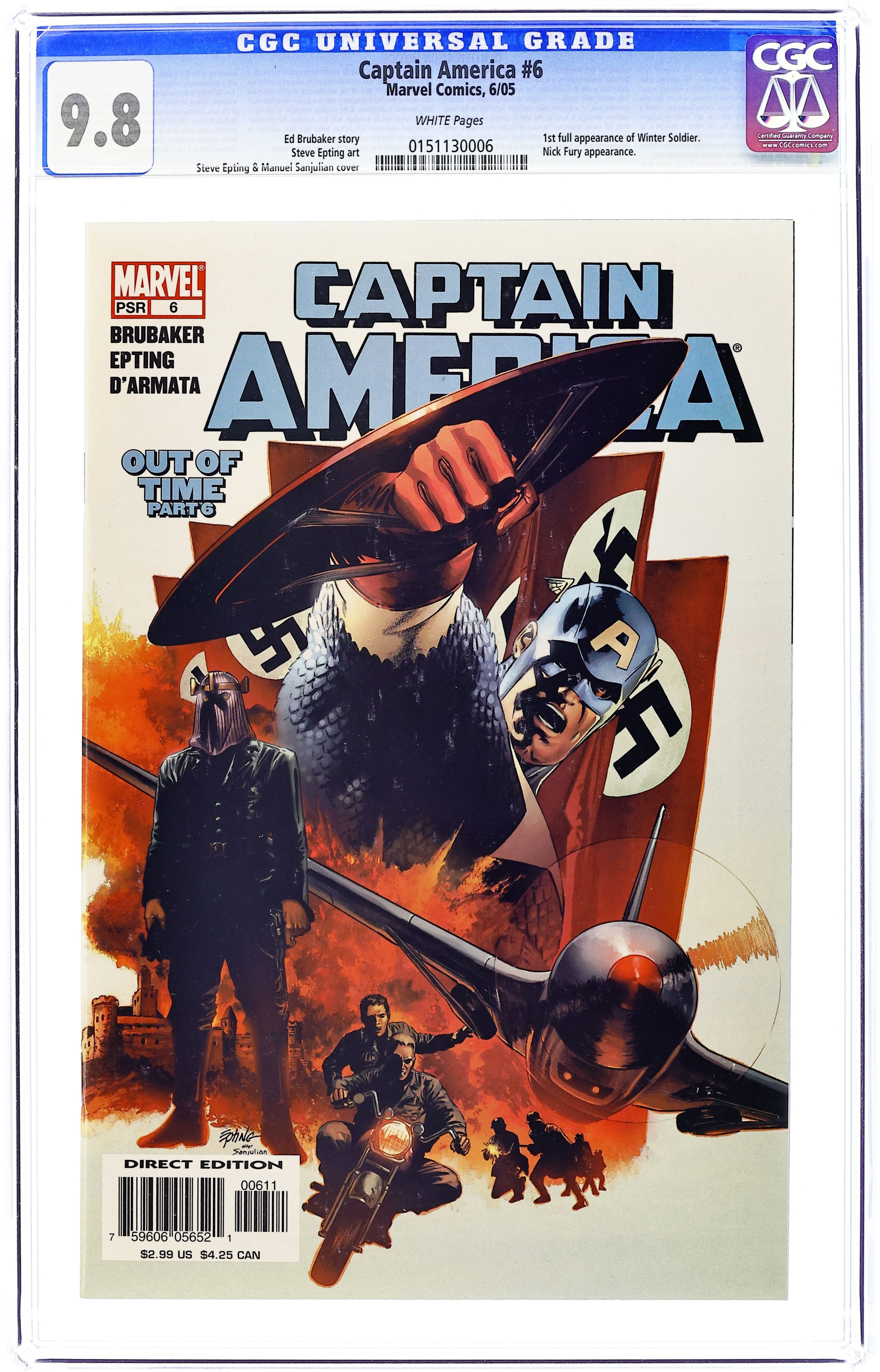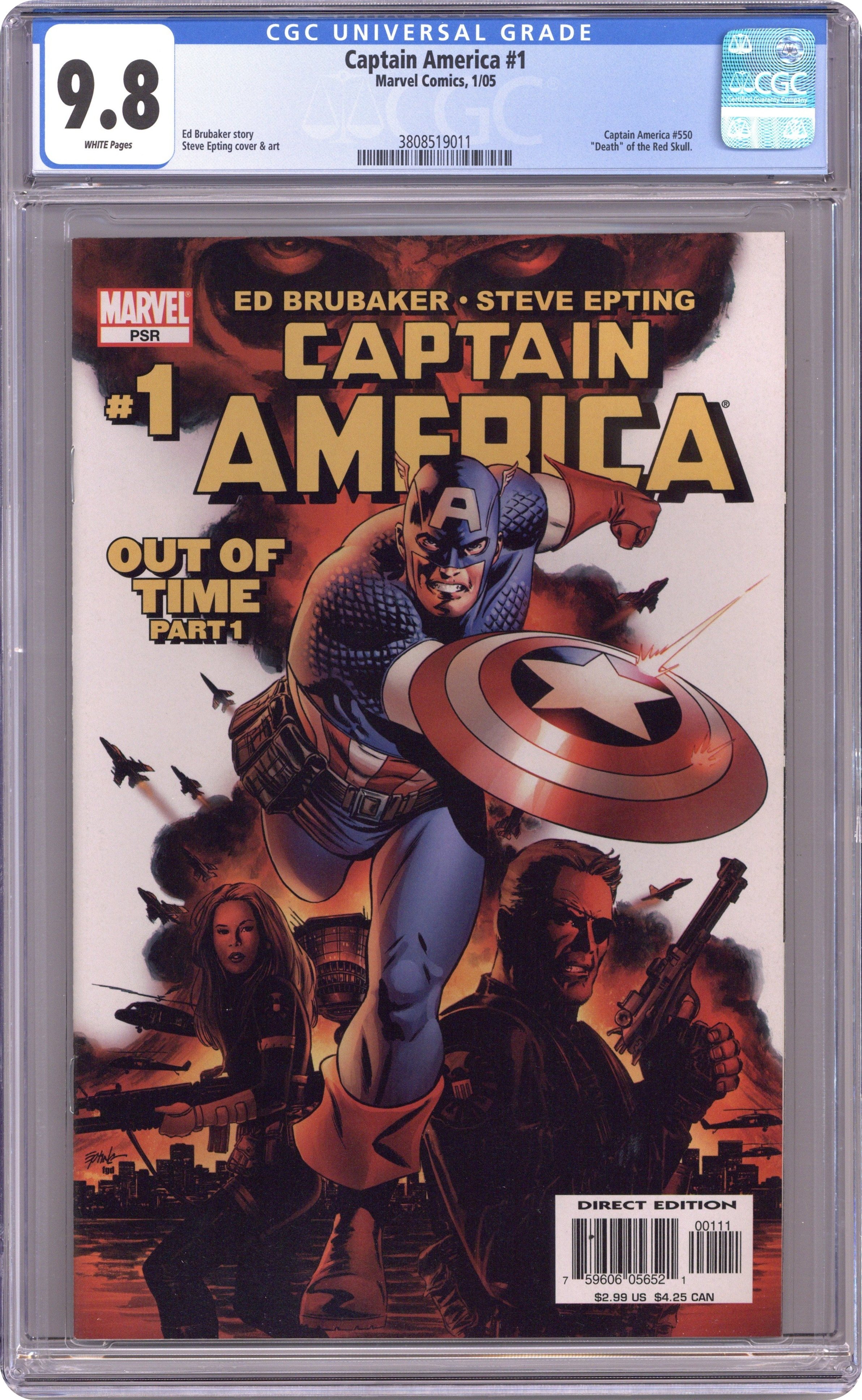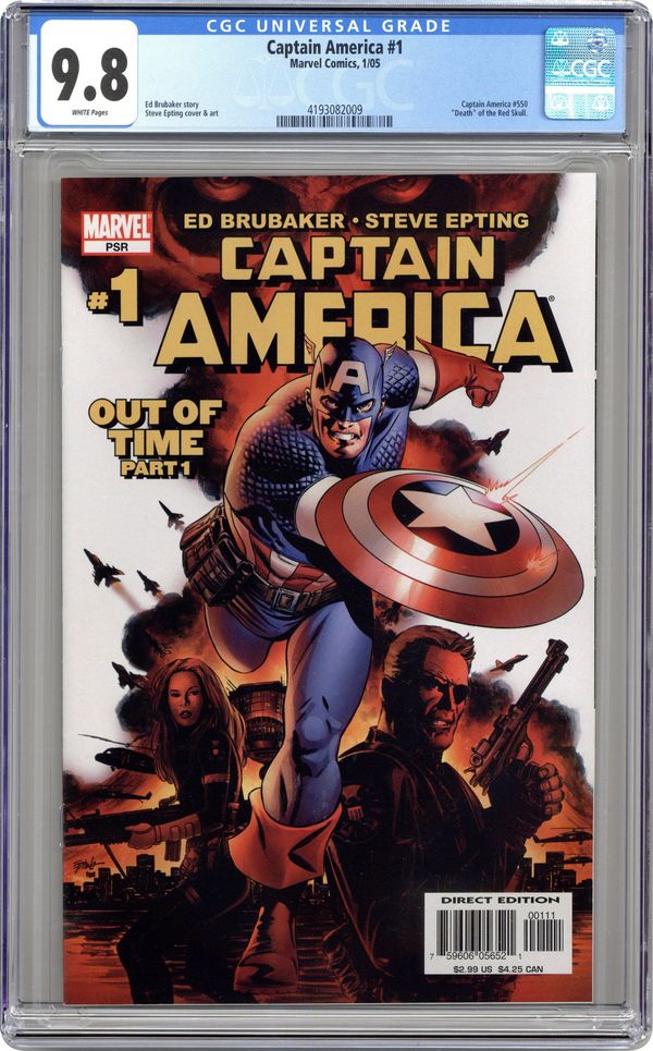 1st cameo app. of Winter Soldier. Winter Soldier: Part 1.1 - Out of Time: Part 1 of 6 - Written by ED BRUBAKER Art & Cover by STEVE EPTING It's a new beginning as four-time Eisner-nominated Best Writer Ed Brubaker makes his Marvel debut, joined by white-hot artist Steve Epting! As the new regular creative team, they will take Cap's life in directions fans will never see coming! In just this first issue, the Red Skull lays the groundwork for his most devastating attack ever on Captain America and the land he holds dear...and with the Cosmic Cube in his possession, how can Cap hope to stop him? Find out in the shocking twist-ending that will have everybody in the industry talking! 32 PGS./ MARVEL PSR NOTE: First partial/Cameo appearance of Winter Soldier. First full appearance is in issue #6 Cover price $2.99.