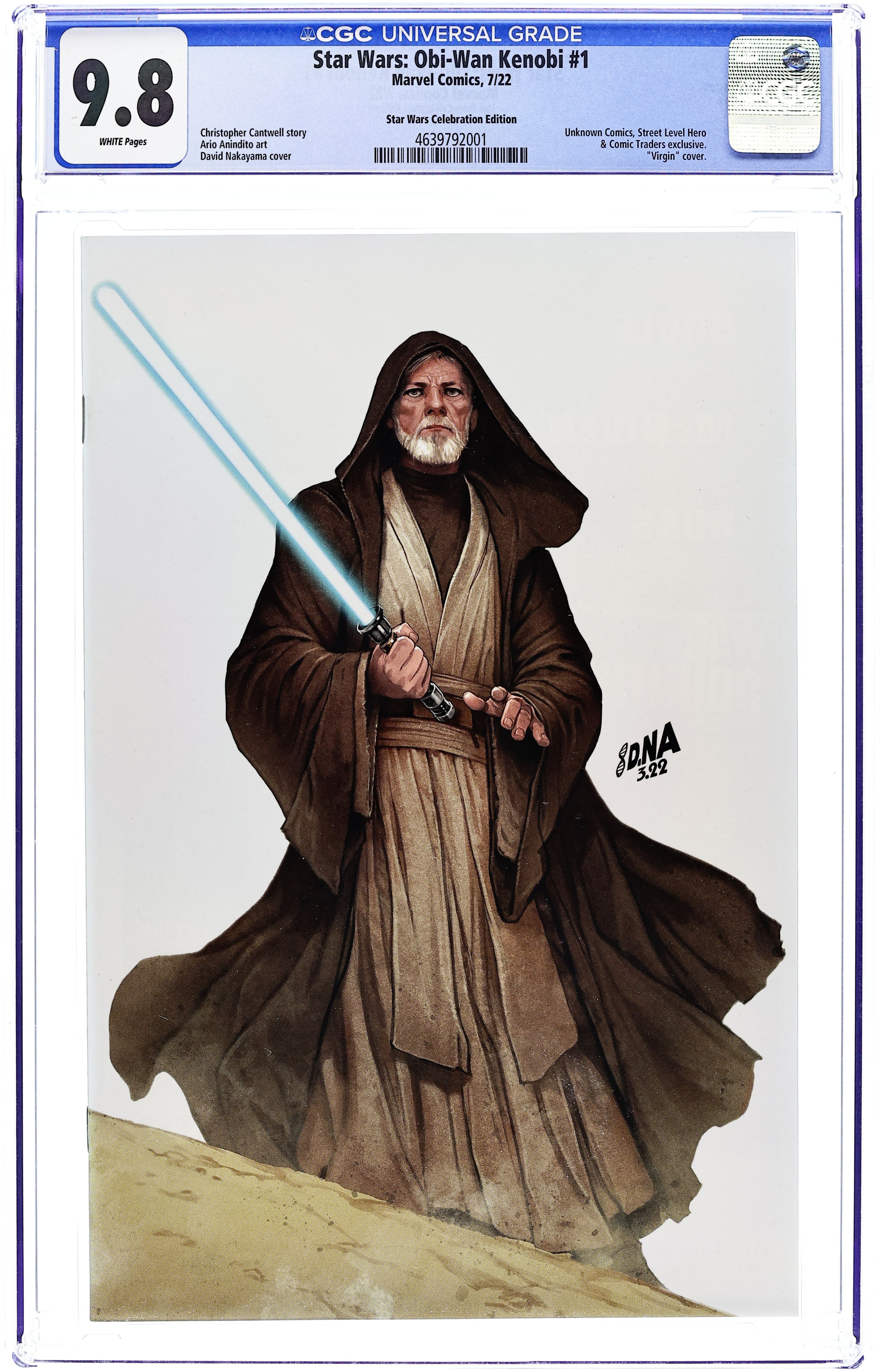 Comics Illuminati (Unknown Comics, Street Level Hero, and Comic Traders) Exclusive Celebration Virgin Cover by David Nakayama. Written by Christopher Cantwell. Art by Ario Anindito. Fast approaches the ultimate destiny of one of the Jedi's most renowned masters! As he spends his final days in the remote deserts of Tatooine, Obi-Wan Kenobi takes time to reflect on - and record - key moments of a heroic life long-lived. Writing in old leather-bound journals from his hermit's hut, Obi-Wan remembers his days as a young Jedi Initiate, his trials as a Padawan, the crucible of Jedi Knighthood and the Clone Wars, and some of the earliest challenges he faced as a true Master of the Force! In this tale, Obi-Wan considers a watershed Youngling adventure he narrowly survived on Coruscant when he was but eight years of age... This is just the beginning of his Jedi journey! 28 pages, full color. Rated T
