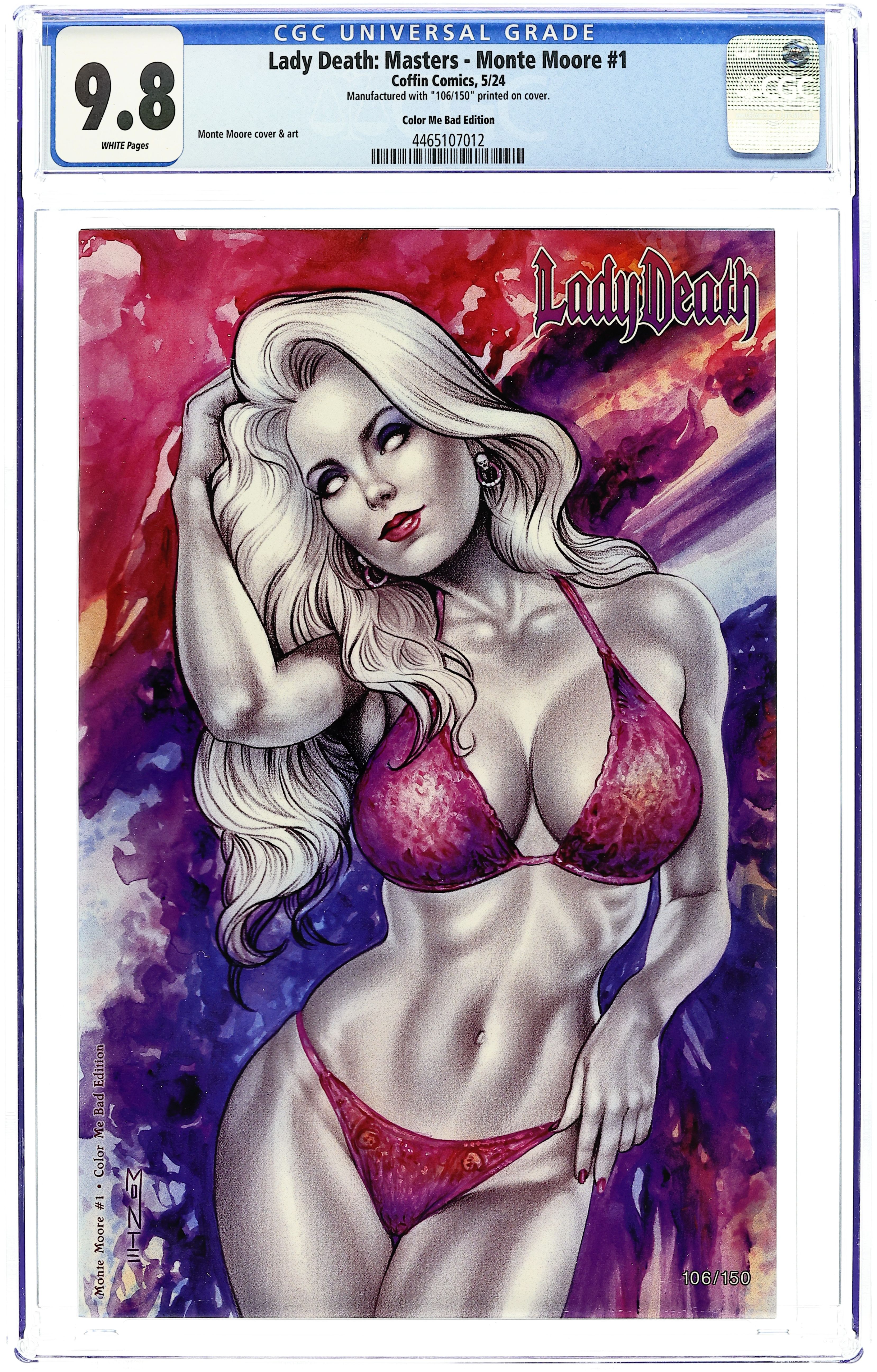 Color Me Bad Edition Variant Cover by Monte Moore - limited to 150 copies. Lady Death: Masters - Monte Moore #1 is a collectible limited edition full-color comic book that highlights fan favorite Monte Moore's exquisite Lady Death over the years at Coffin Comics. Contains 24 pages of full color art! 24 pages, full color.