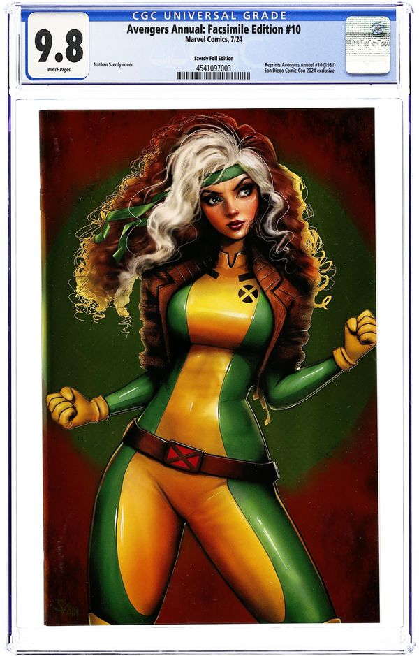 Comics Illuminati (Unknown Comic Books, Comic Traders, and Sleeping Giant) San Diego Comic-Con Exclusive Foil Edition Virgin Cover by Nathan Szerdy. Facsimile reproduction of Avengers (1963 1st Series) Annual #10. Written by Chris Claremont. Art by Michael Golden. This one really does have it all: the Avengers, the X-Men, Spider-Woman and the first appearance of Rogue! When Jessica Drew saves an unconscious Carol Danvers from plummeting from the Golden Gate Bridge, she seeks the aid of the X-Men - and Professor X discovers that Carol's powers and memories have been absorbed by a dangerous young mutant called Rogue! This deadly new recruit to Mystique's Brotherhood of Evil Mutants won't stop there - next, she targets Captain America and Thor! The remaining Avengers must battle the Brotherhood with Spider-Woman alongside them! But when the dust settles, what will the future hold for Carol Danvers, the woman who was once Ms. Marvel? It's one of the all-time great Marvel comic books, boldly re-presented in its original form, ads and all! Reprinting AVENGERS ANNUAL #10. 48 pages, full color. Rated T+ Cover price $6.99.