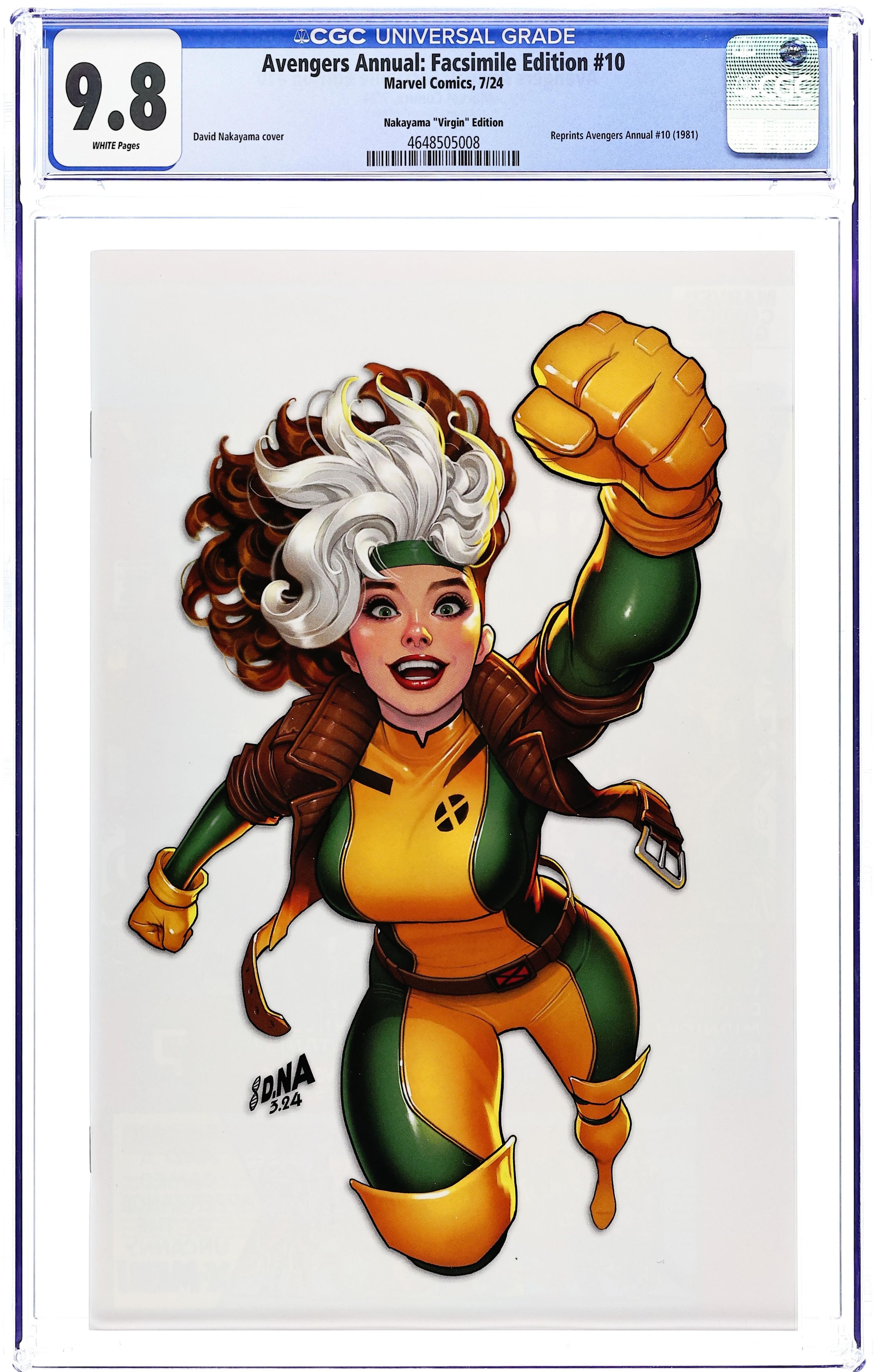 Comics Illuminati (Unknown Comic Books, Comic Traders, and Sleeping Giant) Exclusive Virgin Cover by David Nakayama. Facsimile reproduction of Avengers (1963 1st Series) Annual #10. Written by Chris Claremont. Art by Michael Golden. This one really does have it all: the Avengers, the X-Men, Spider-Woman and the first appearance of Rogue! When Jessica Drew saves an unconscious Carol Danvers from plummeting from the Golden Gate Bridge, she seeks the aid of the X-Men - and Professor X discovers that Carol's powers and memories have been absorbed by a dangerous young mutant called Rogue! This deadly new recruit to Mystique's Brotherhood of Evil Mutants won't stop there - next, she targets Captain America and Thor! The remaining Avengers must battle the Brotherhood with Spider-Woman alongside them! But when the dust settles, what will the future hold for Carol Danvers, the woman who was once Ms. Marvel? It's one of the all-time great Marvel comic books, boldly re-presented in its original form, ads and all! Reprinting AVENGERS ANNUAL #10. 48 pages, full color. Rated T+ Cover price $6.99.