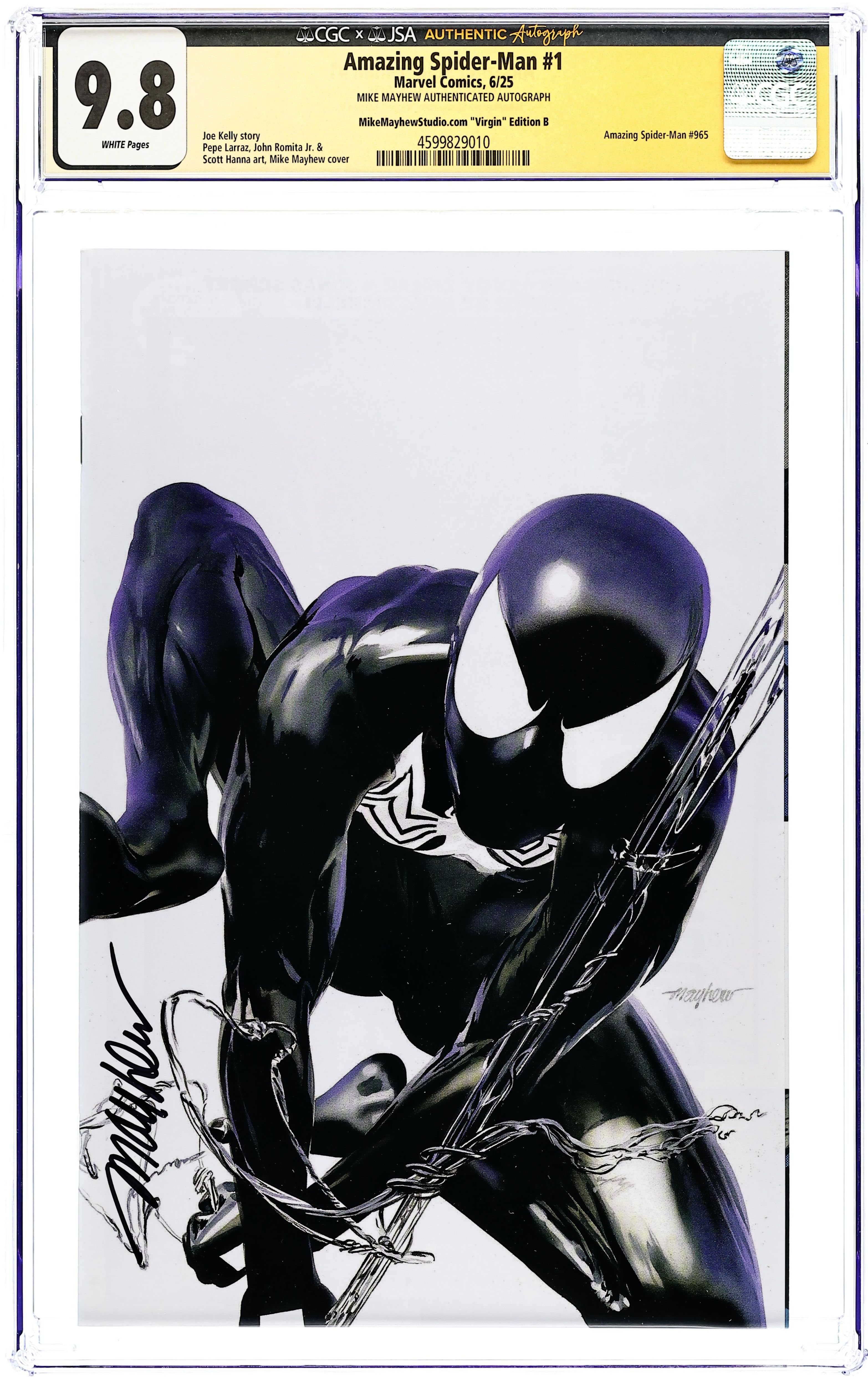 Mike Mayhew Studios Exclusive "Black-Suit" Edition Virgin Cover by Mike Mayhew. Written by Joe Kelly. Art by Pepe Larraz; John Romita Jr. ALIVE & THWIPPING! The next era of AMAZING SPIDER-MAN has arrived! Peter is, shockingly, without a job and looking for gainful employment, but his job search is interrupted by a RAMPAGING RHINO who is but the tip of a sinister iceberg. What major Spider-Villain is working behind the scenes weaponizing other Spider-Villains including one we haven't seen in OVER SEVEN YEARS?! Also, what is that Goblin-free Norman Osborn up to anyway? 40 pages, full color. Rated T