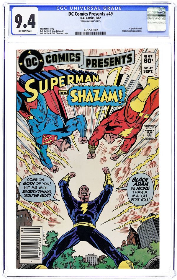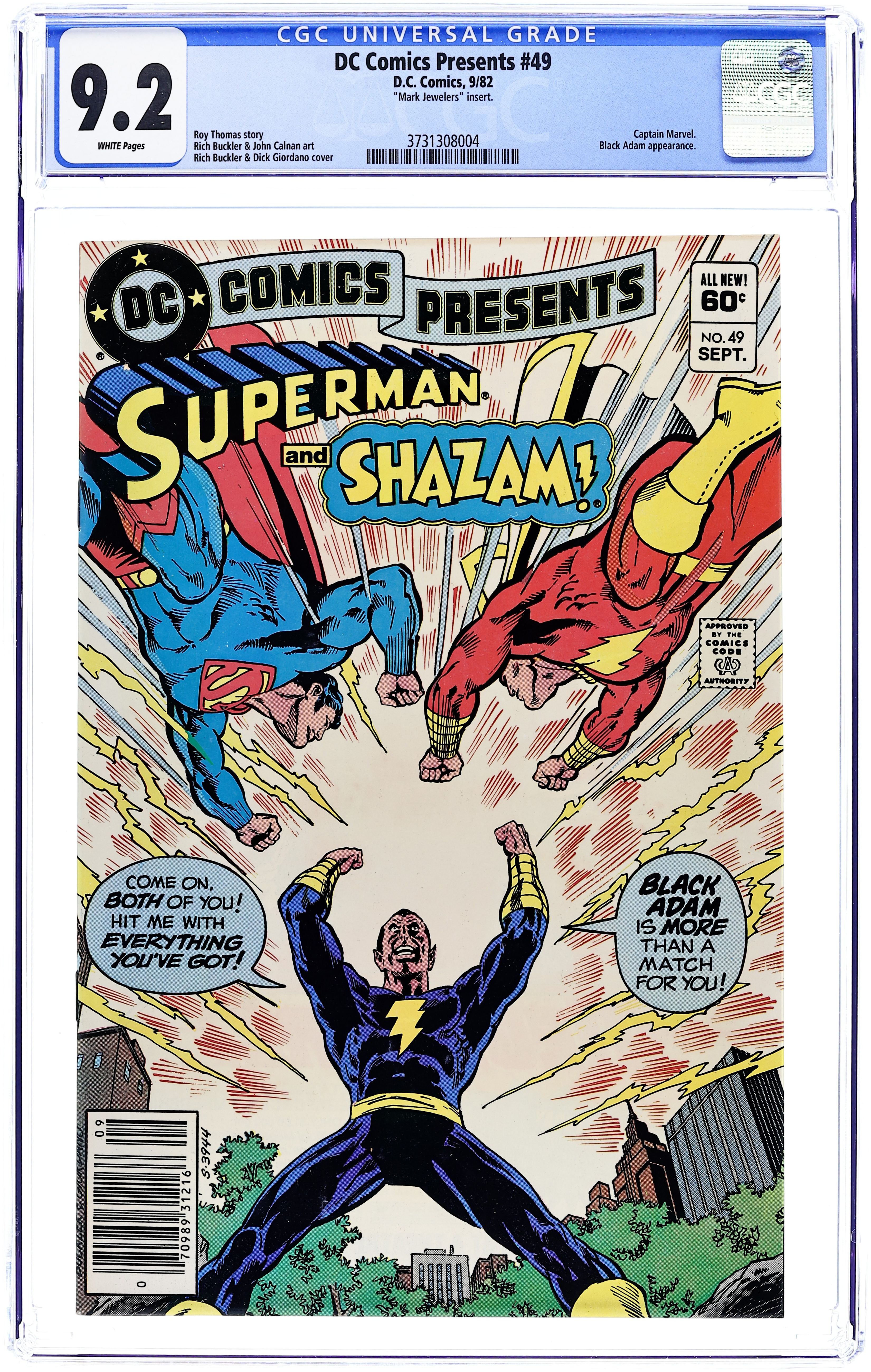 Mark Jewelers Advertisement Insert Variant. DC Comics Presents: Superman and SHAZAM! - Written by Roy Thomas and Paul Kuppergerg. Art by Rich Buckler and John Calnan. Can even the combined power of Superman and Captain Marvel stand up to the awesome might of Black Adam?! 32 pages, FC. Cover price $0.60.