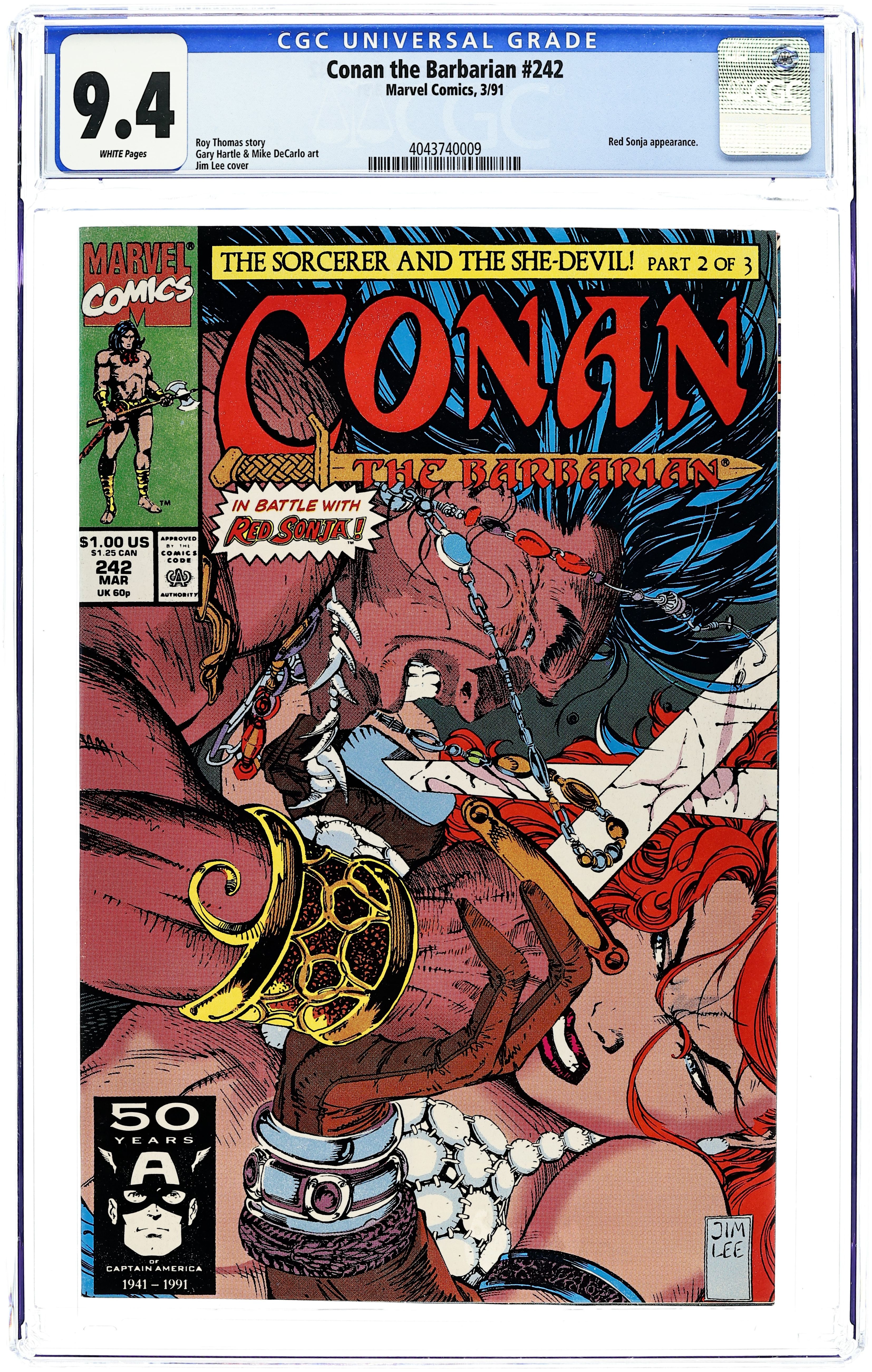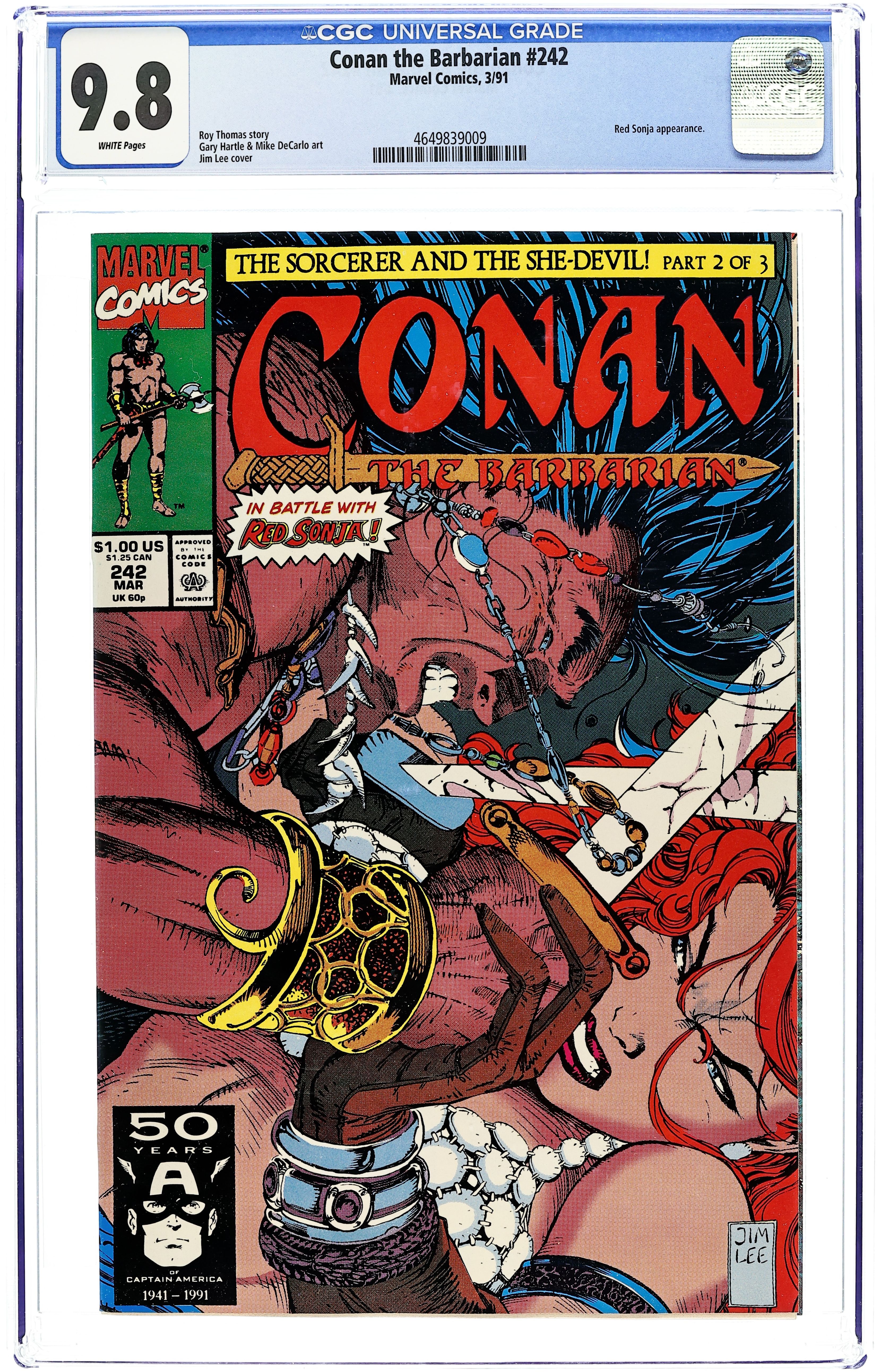 Direct Edition. Cover art by Jim Lee. They Came To Castle Zukala, script by Roy Thomas, pencils by Gary Hartle, inks by Mike DeCarlo; Conan, Red Sonja and Karanthes arrive at El-Ron's castle for the wedding of El-Ron and Red Sonja; El-Ron's past is revealed and Conan is taken by Jagga-Nota to his home dimension; "The Sorceror and the She-Devil" part 2. Letters page has information on Robert E. Howard's Hyborian lands. 36 pgs. Cover price $1.00. Cover price $1.00.