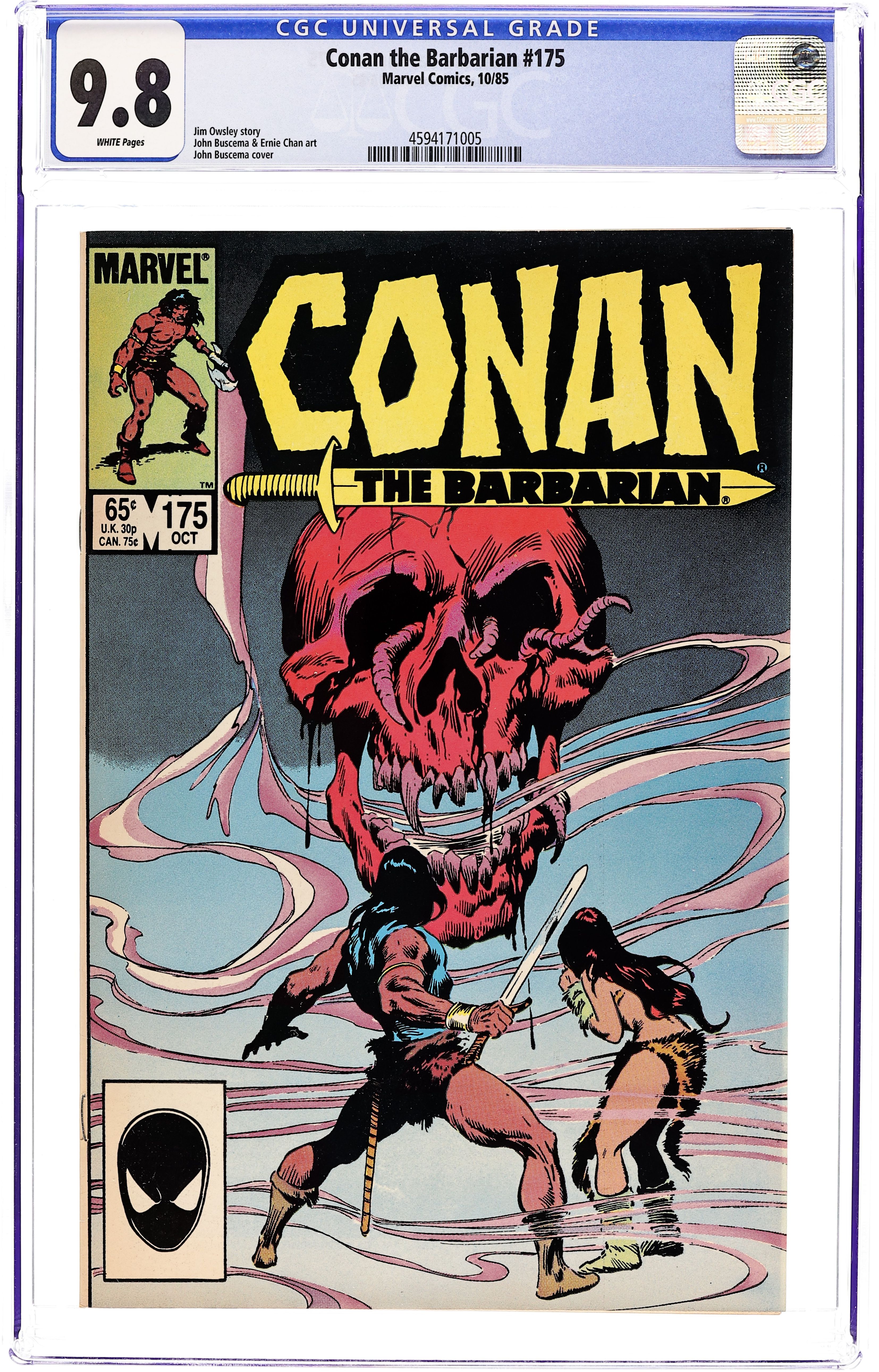 Newsstand Edition. Cover art by John Buscema. The Scarlet Personage! starring Conan, Tetra (first appearance), Delmurio (first appearance), and The Scarlet Personage (first appearance), script by Jim Owsley, pencils by John Buscema, inks by Ernie Chan; Conan battles the Spectre of Death. 36 pgs. Cover price $0.75. Cover price $0.65.