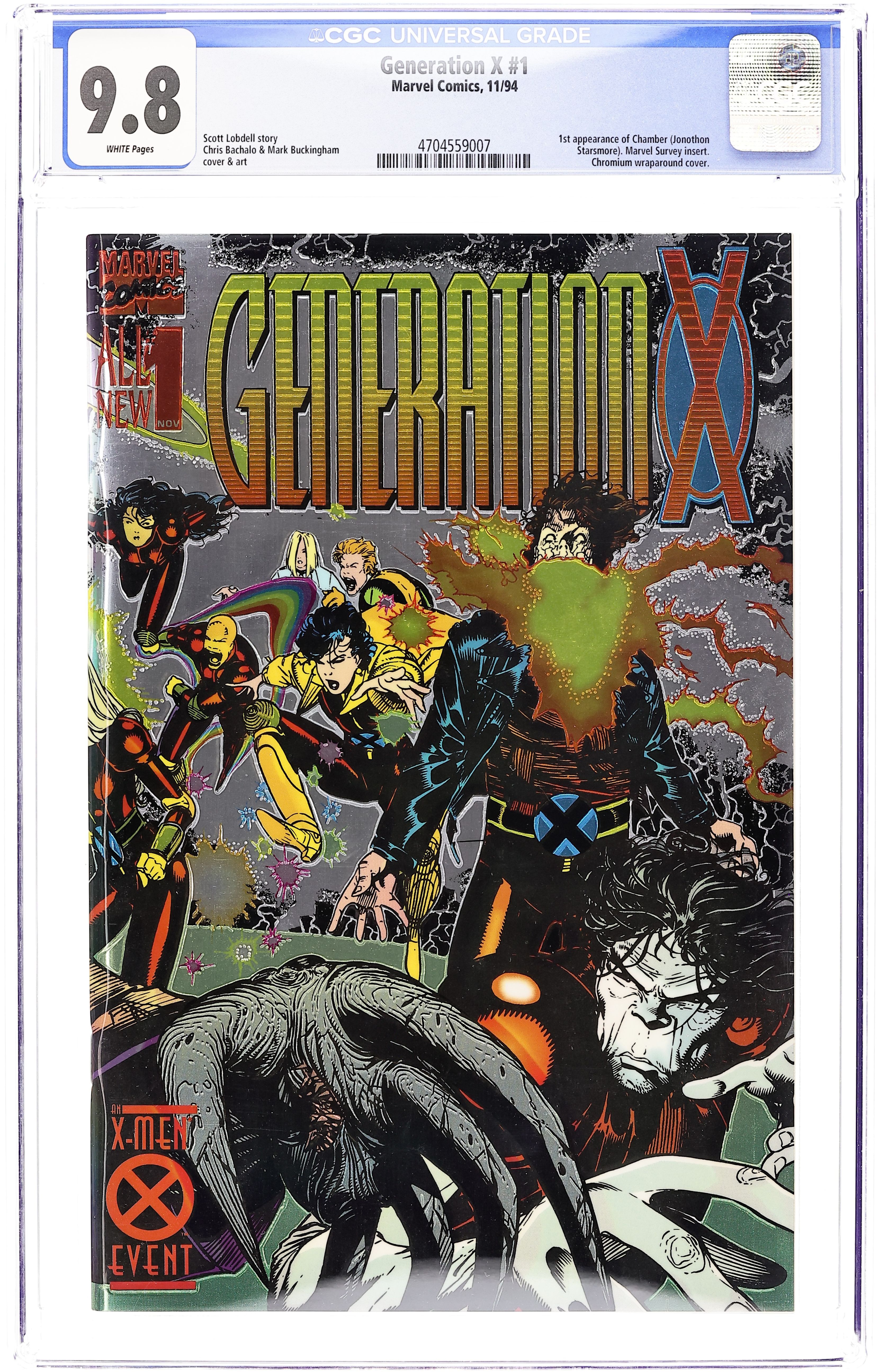 Newsstand Edition. Chromium cover. Scott Lobdell script. Chris Bachalo art. Mark Buckingham inks. This issue kicks off a brand new generation of X-Men: Husk, Jubilee, M, Chamber, Skin, Penance, Synch, and Mondo led by Banshee and White Queen. Cover price $3.95.