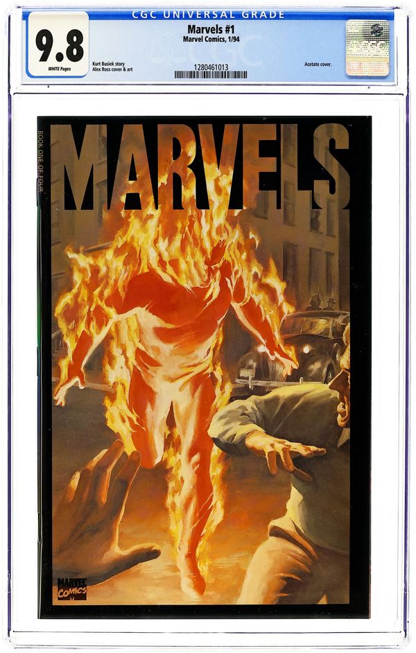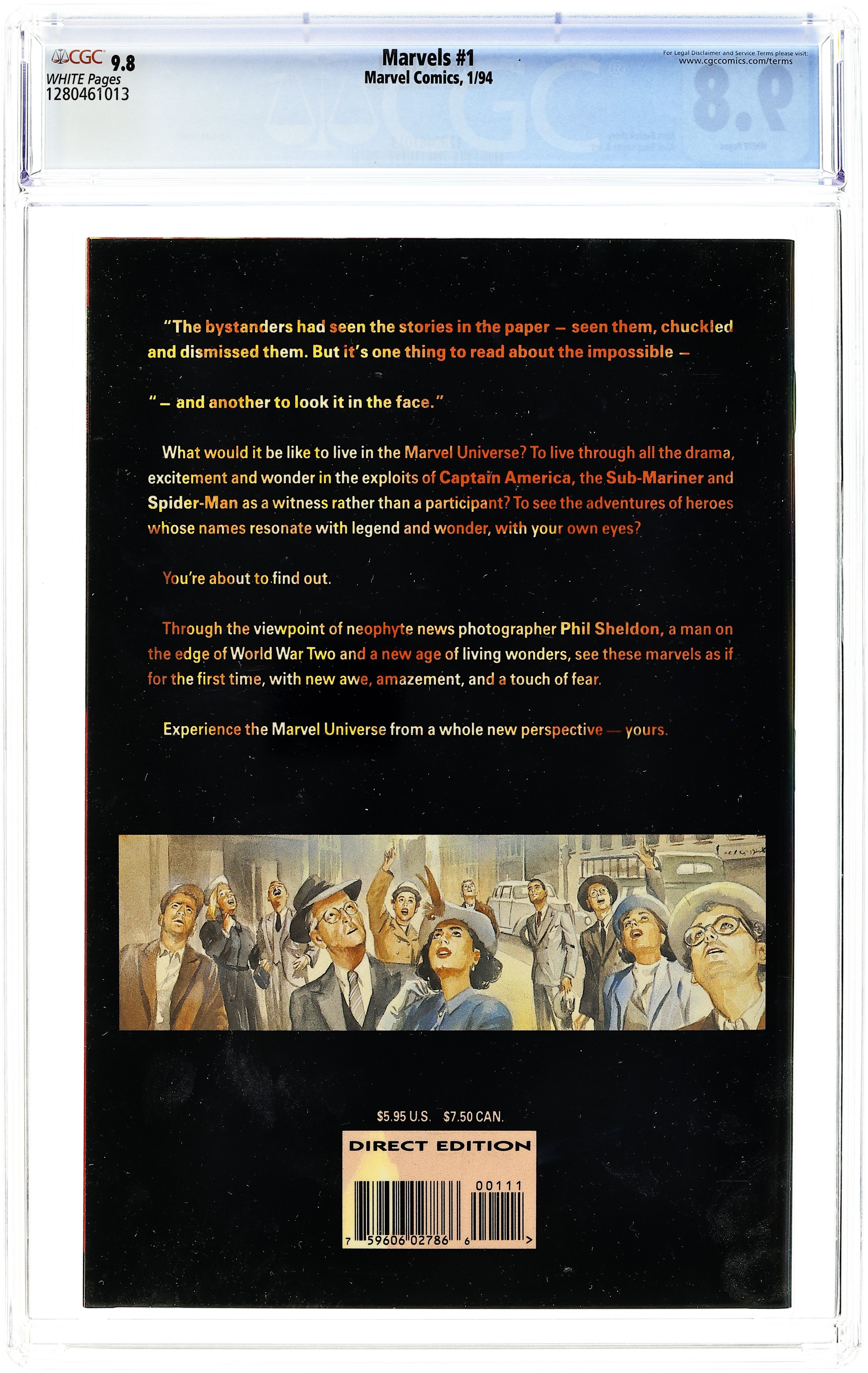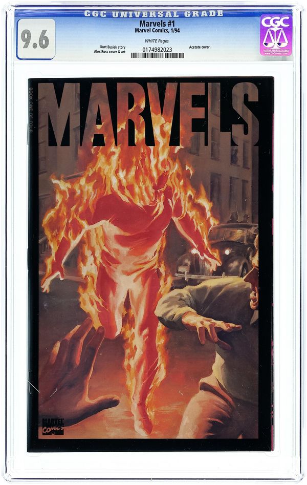 Steeped in unprecedented realism, this groundbreaking series tells the tale of the classic Marvel Universe as seen through the eyes of photojournalist Phil Sheldon. Book one focuses on early, World War II-era Marvel and the introduction of the Human Torch and the Submariner. Written by Kurt Busiek, with painted art by Alex Ross. This is the 1st printing and has an acetate (plastic) outer cover. The 2nd printing does not have an acetate cover. Cover price $4.95.