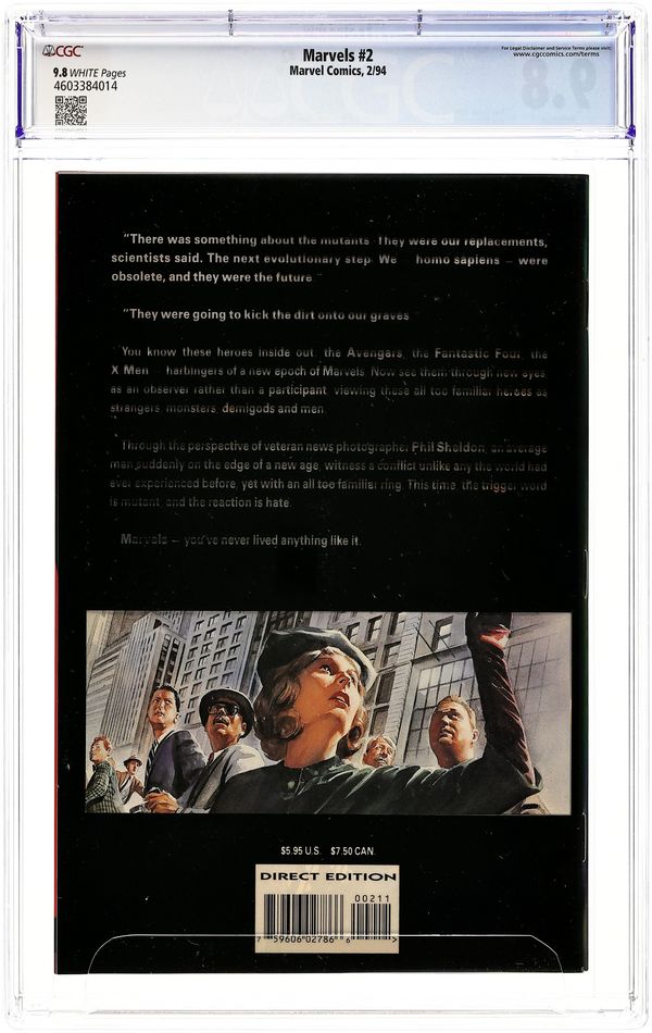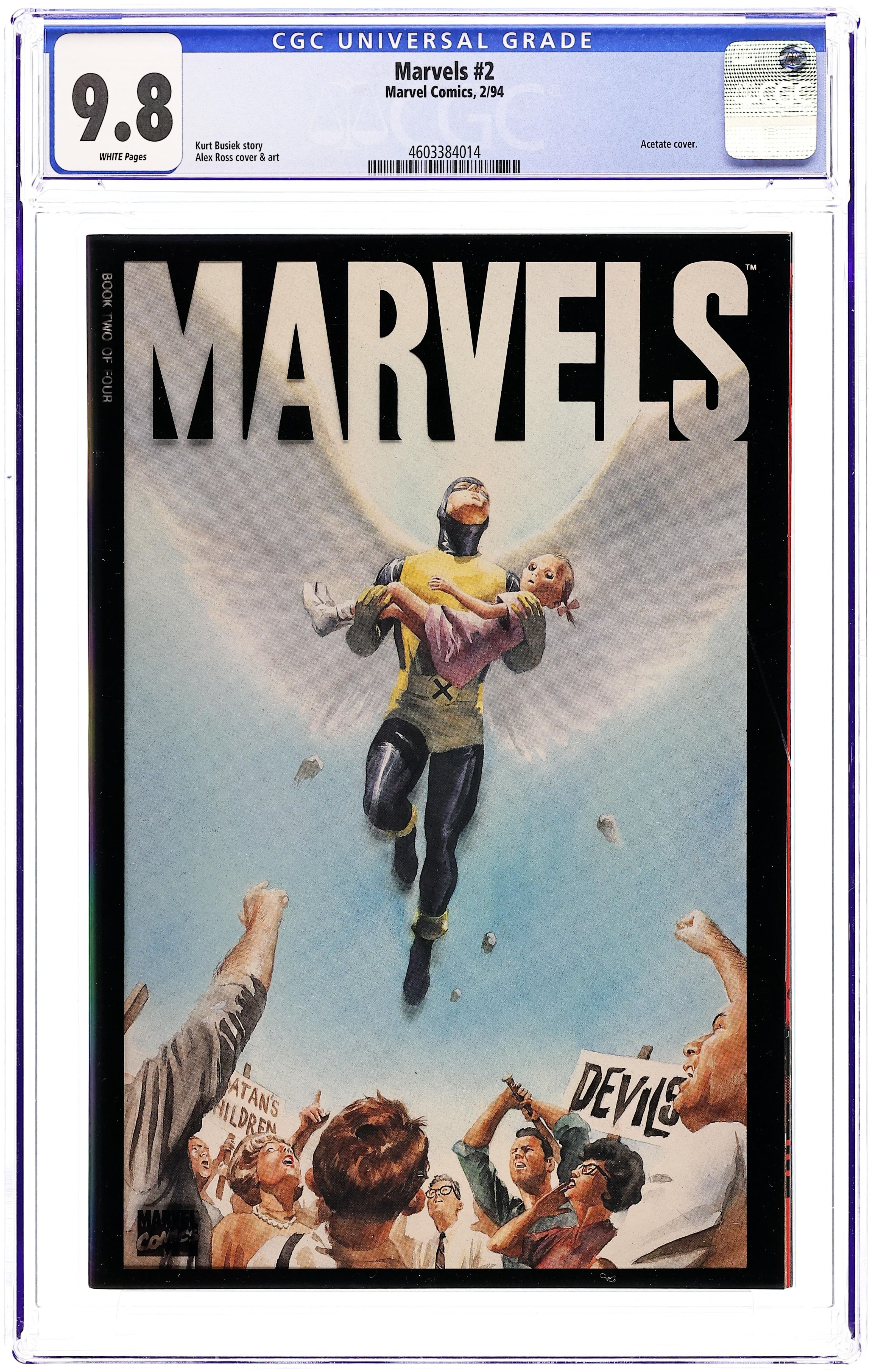 Steeped in unprecedented realism, this groundbreaking series tells the tale of the classic Marvel Universe as seen through the eyes of photojournalist Phil Sheldon. Book two finds everyday citizens in awe of such white bread heroes as Iron Man and Captain America, but swept up in a wave of anti-mutant hysteria. Look for special guests (such as Dick Van Dyke and John Lennon) at the wedding of Reed Richards and Sue Storm. Written by Kurt Busiek, with painted art by Alex Ross. This is the 1st printing and has an acetate (plastic) outer cover. The 2nd printing does not have an acetate cover. Cover price $5.95.