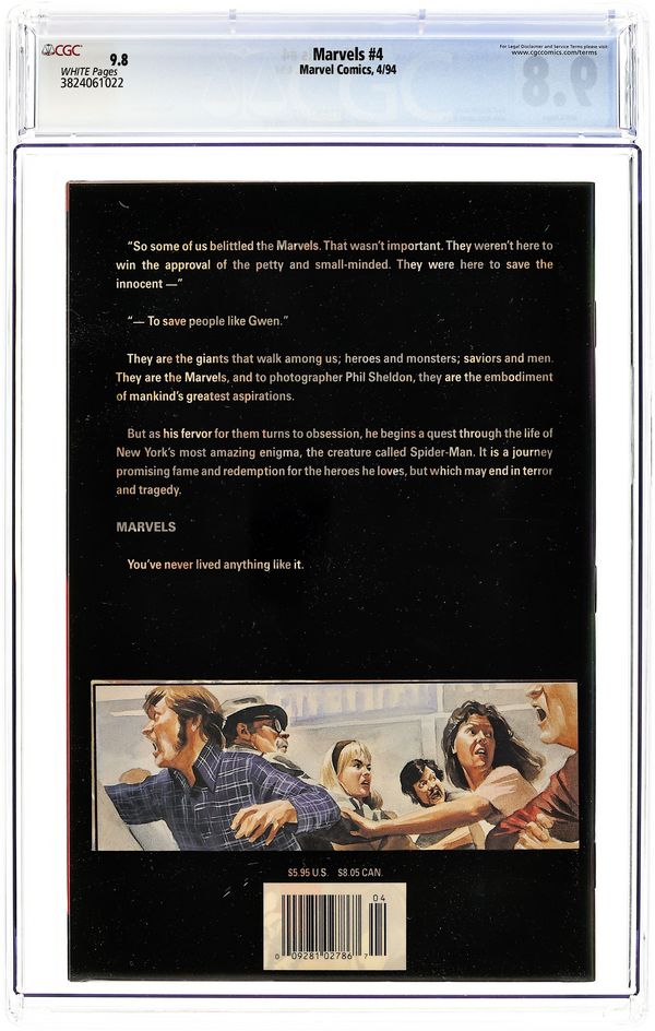 Steeped in unprecedented realism, this groundbreaking series tells the tale of the classic Marvel Universe as seen through the eyes of photojournalist Phil Sheldon. Book four zeroes in on the lovely Gwen Stacy and her tragic death. Written by Kurt Busiek, with painted art by Alex Ross. This is the 1st printing and has an acetate outer cover. The 2nd printing does not have an acetate cover. Cover price $5.95.