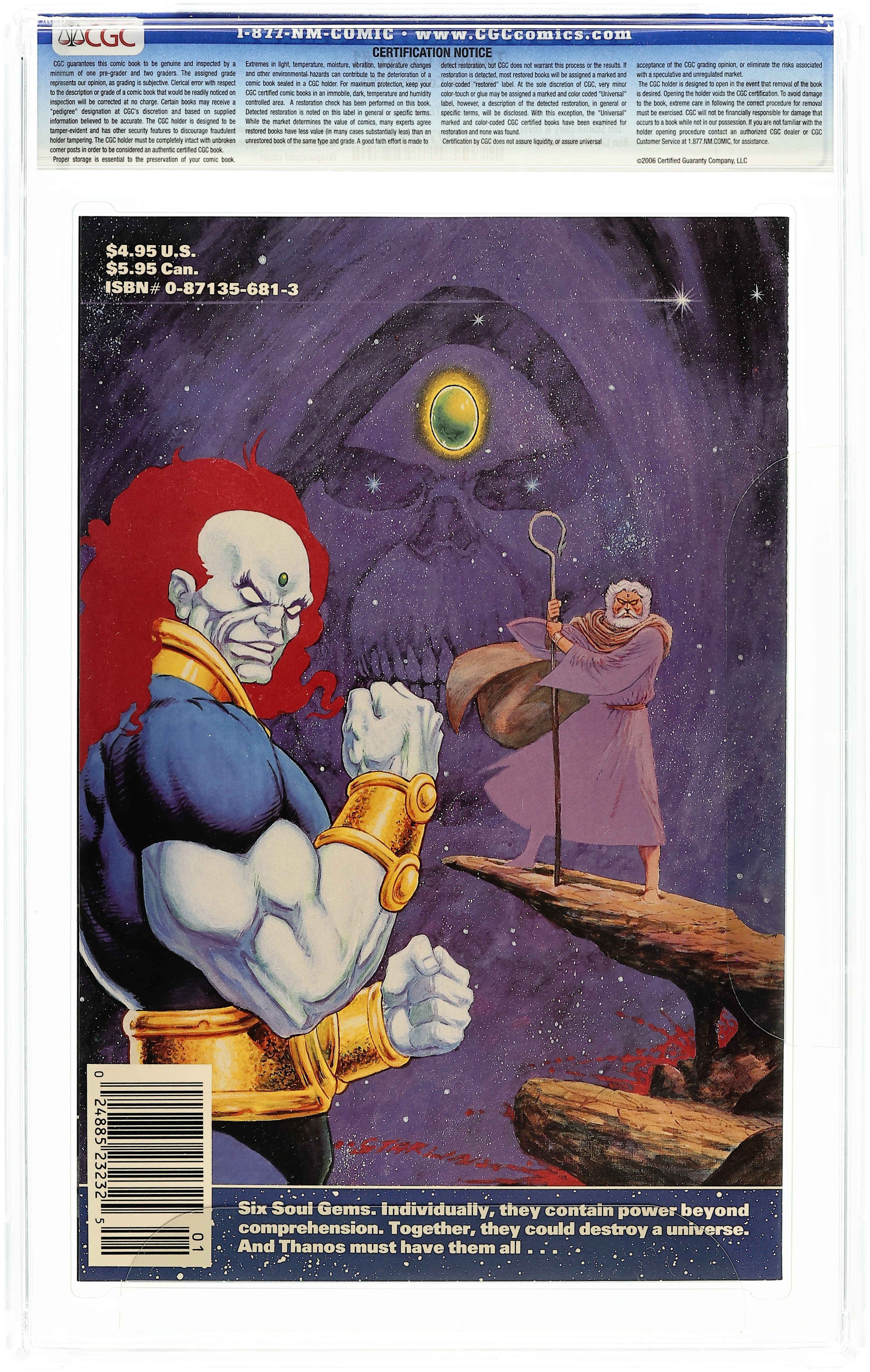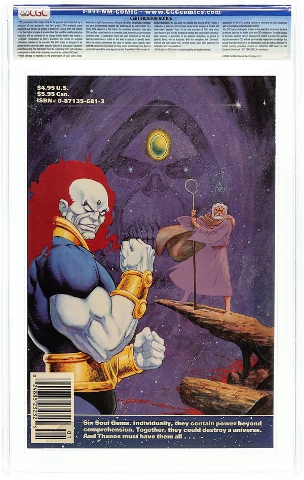 1st Printing. "Schemes and Dreams!" Written by Jim Starlin. Art by Ron Lim John Beatty. Six Soul Gems. NOTE: This tale picks up after the events of Silver Surfer (1987 2nd Series) #38. Thanos the Mad Titan has been resurrected by the entity known as Death. Resurrected and given a dark mission. In order to accomplish this mission, Thanos will seek ultimate power - the Soul Gems! Individually, they contain power beyond comprehension. Together, they could destroy a universe. And Thanos must have them all.… Featuring the Elders of the Universe Champion and Gardiner, and the nefarious In-Betweener. 48 pages, FC Cover price $4.95.