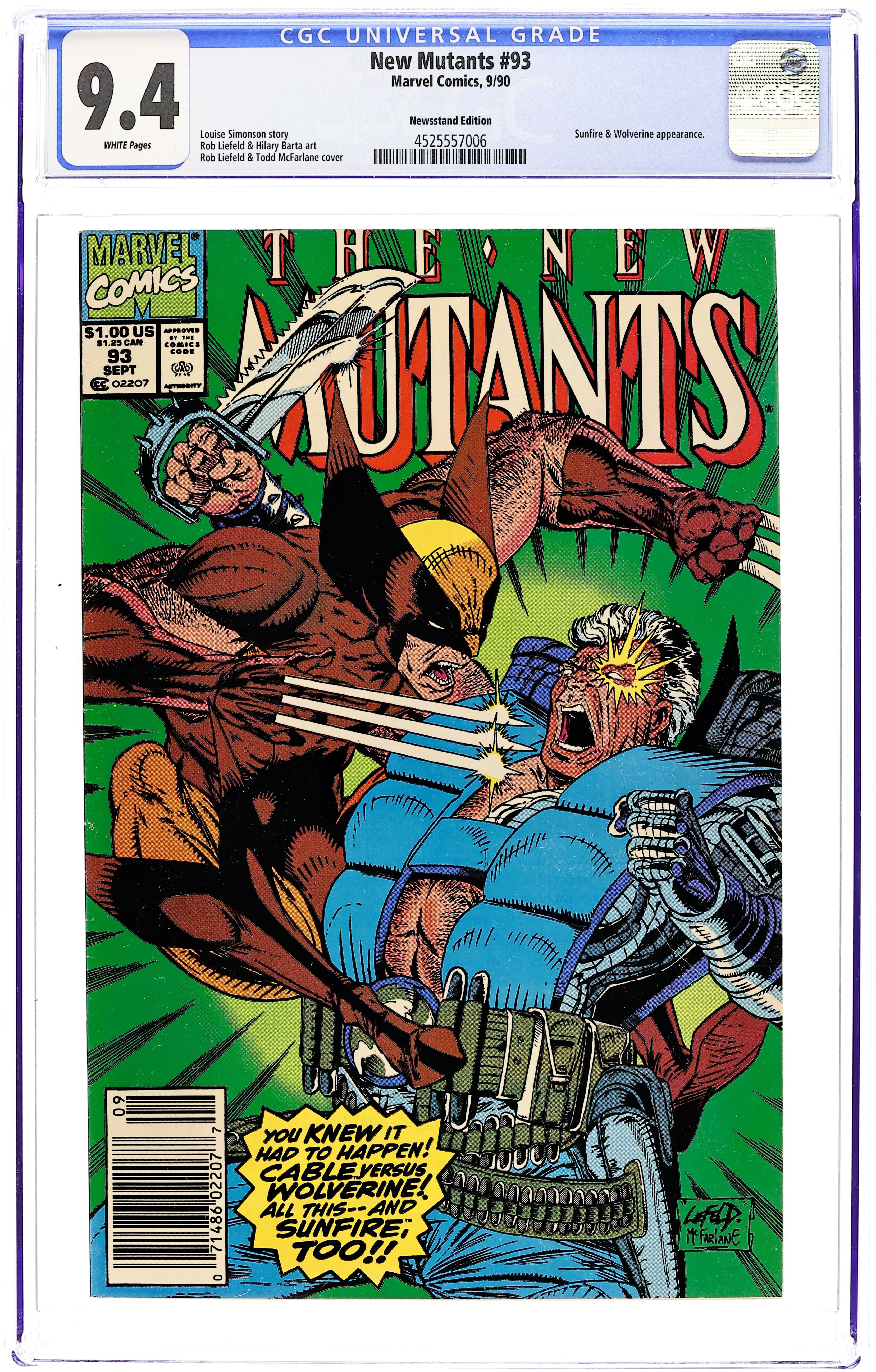Cover art by Rob Liefeld (based on John Byrne's cover for Uncanny X-Men 138). The Beginning of the End, Part Two, script by Rob Liefeld (plot) and Fabian Nicieza (script), art by Rob Liefeld; Feral, a Morlock, flees from Masque and ends up at X-Mansion; Cable invites Warpath to join the New Mutants, and after his village is destroyed by the Hellfire Club, he accepts; Gideon convinces Sunspot to leave the team; Cannonball challenges Cable; Shatterstar appears on the floor of the Danger Room. Statement of Ownership: Total No. Copies Printed (net press run): Average no. of copies each issue during preceding 12 months: 289,387. Single issue nearest to filing date: 318,102. 36 pgs. $1.00. Cover price $1.00.
