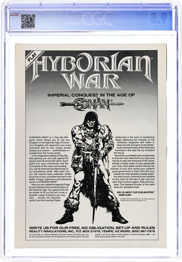 Direct Edition. Conan stars in "Death Stalks a Well-Tended Garden." Script by Roy Thomas, breakdowns by John Buscema, finished art by E.R. Cruz. This is part 3 of the adaptation of "Conan and the Spider-God" by L. Sprague de Camp. Red Sonja stars in "Battles Lost and Won." Script by Roy and Dann Thomas, art by Reggie Jones. This is part 3 of "The Road to Zanadu." Glenn Greenberg reviews the new Conan novels. E.R. Cruz pin-up. John Watkiss cover. Cover price $2.25.