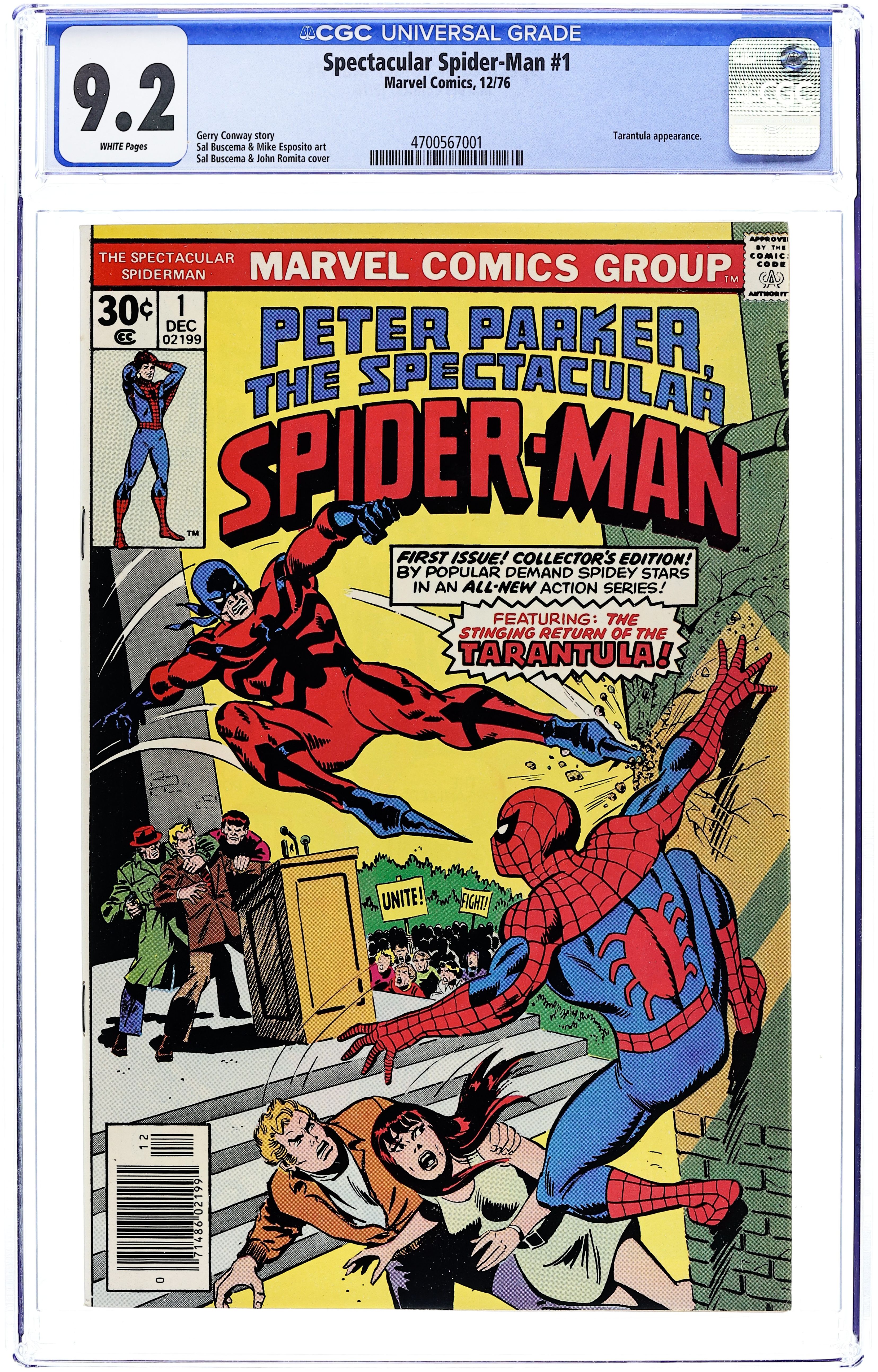 Ends Apr 15 7:51 PM CST Bid History 16 bids Current Bid $277 Your Secret Max Bid If you'd like to bid, please log in or register. "Twice Stings The Tarantula!" Part 1 of 3. Script by Gerry Conway. Pencils by Sal Buscema. Inks by Mike Esposito. Cover by Sal Buscema and John Romita. The first issue of a brand new series for Spider-Man! The story opens with a bang as the Tarantula kidnaps the Empire State University vice-chancellor, despite the best efforts of the web-slinger, Flash Thompson, and Mary Jane Watson! Next, the Tarantula tries to kill the mayor, but this time the Spectacular Spider-Man is ready! Can the wall-crawler beat the Tarantula and save Mayor Abe Beame? First appearance of Edward Lansky (aka Lightmaster). (Notes: The Spectacular Spider-Man series became the third monthly title for Spider-Man. The first issue of the series debuted the same month as Amazing Spider-Man 163 and Marvel Team-Up 52. The letters page contains an essay from Gerry Conway describing the plans for the new Spider-Man title.) 32 pages Cover price $0.30.