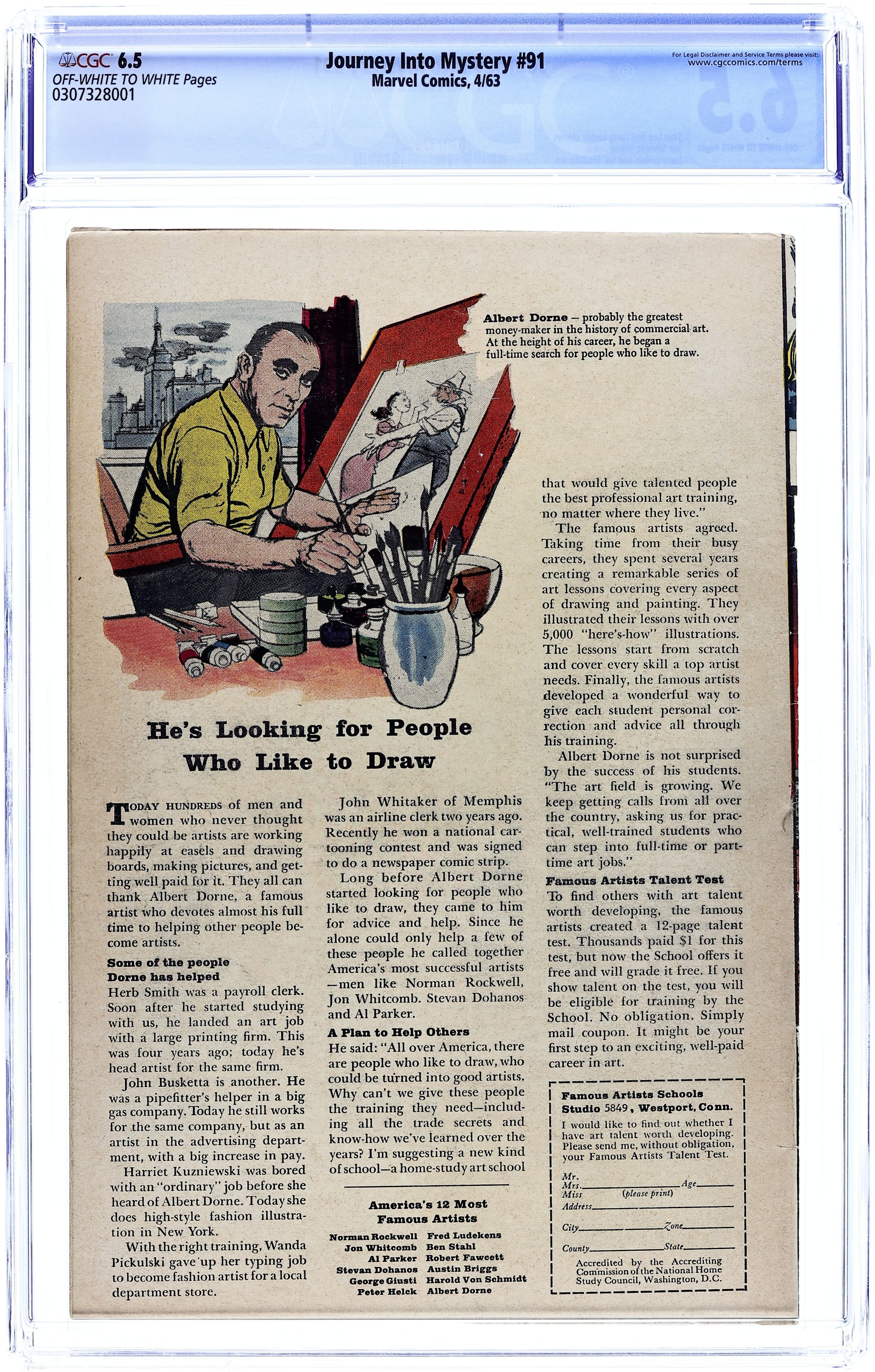 Cover pencils by Jack Kirby, inks by Dick Ayers. First appearance Loki and Heimdall, plus cameos of Odin, Balder, and Tyr, in "Trapped by Loki, the God of Mischief!", script by Stan Lee (plot) and Larry Lieber (script), pencils by Jack Kirby, inks by Dick Ayers; Loki escapes from his prison in Asgard and comes to Earth to get revenge on Thor; The trickster hypnotizes him to help make mischief. "The Clock" two-page text story. "Filbert's Frightful Future!", script by Stan Lee, art by Don Heck; A greedy scientist builds a time machine to visit the future and make money, but he finds himself stranded in a void, since the future does not yet exist. "Off-Limits!", script by Stan Lee, art by Steve Ditko; This story casts the character of Rip Van Winkle as a humanoid alien who visits planet Earth in violation of galactic travel guidelines which have declared the planet off limits. 36 pgs., full color. $0.12. Cover price $0.12.