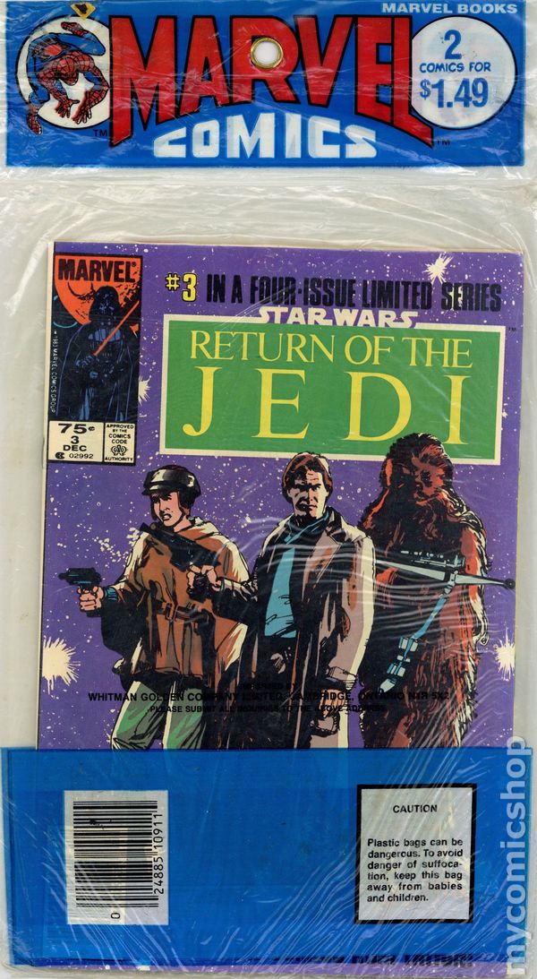 Polybagged two pack set, contains issues 3 and 4 of the Return of the Jedi 1983 Marvel movie adaptation. Cover price $1.49.