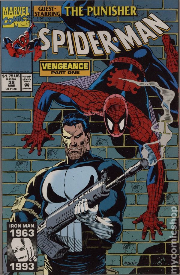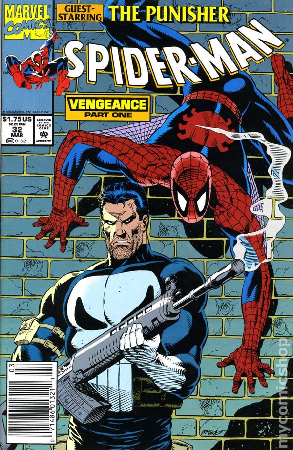 Newsstand Edition. Vengeance Part 1 of 3. Guest-starring the Punisher. Script by Steven Grant. Art by Bob McLeod. Cover by Bob McLeod. An imposter dressed as Spider-Man is roaming the streets of the Big Apple and killing people! And of course Peter Parker is horrified! The real web-slinger quickly takes to the rooftops and alleyways to find the wall-crawling impersonator. But someone else -- a certain gun-toting vigilante -- is also aware of the murders. And the Punisher is going to stop Spider-Man -- the real one or the fake one -- by any means necessary! Cameo appearance by Mary Jane Watson. 32 pages. Cover price $1.75.