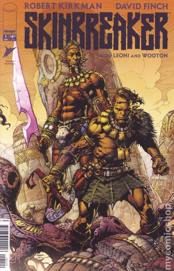 4th Printing. Written by Robert Kirkman. Art by David Finch, Annalisa Leoni. Cover by David Finch. SERIES PREMIERE FOR FANS OF INVINCIBLE UNIVERSE: BATTLE BEAST COMES YOUR NEW FAVORITE SERIES! ** The dream team of ROBERT KIRKMAN** (THE WALKING DEAD_, _INVINCIBLE) and superstar artist DAVID FINCH (Batman, New Avengers) present a visionary action epic unlike anything youve ever seen. Enor has led his tribe for many seasons, but his time as Chieftan is coming to an end. He wields the mighty SKINBREAKER, but at his age, he can barely lift it. Will Enors reluctant heir, Anok, take over before their world falls to ruin? As a bloody power struggle begins, an even bigger threat lurks in the darkness beyond their village. SKINBREAKER tells the story of a people on the verge of collapse and their fight for survival as the many threats they face close in for the kill. 32 pages, full color. Rated T+ Cover price $4.99.