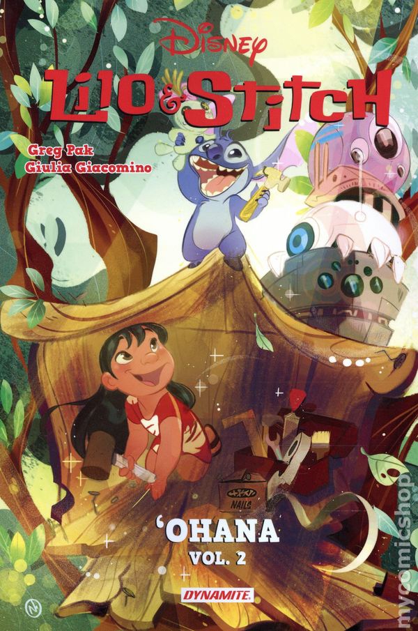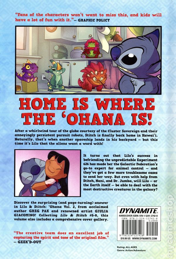 Volume 2 - 1st printing. Collects Lilo and Stitch (2024 Dynamite) #5-8. Written by Greg Pak. Art by Giulia Giacomino. Cover by Nicoletta Baldari. Back Cover by Giulia Giacomino. HOME IS WHERE THE OHANA IS! After a whirlwind tour of the globe courtesy of the Cluster Sovereign and their annoyingly persistent pursuit robots, Stitch is finally back home in Hawaii. Naturally, that's when another spaceship lands in his backyard — but it this time its Lilo that the aliens want a word with! It turns out that Lilo's success in befriending the unpredictable Experiment 626 has made her the Galactic Federations go-to expert for animal control — and they've got a few more troublesome cases to send her way. But even with help from Stitch, Nani, and Dr. Jumba, will Lilo — or the Earth itself — be able to deal with the most destructive creatures in the galaxy? Discover the surprising (and page-turning) answer in Lilo & Stitch: 'Ohana Vol. 2, from acclaimed author GREG PAK and renowned artist GIULIA GIACOMINO! Collecting issues #5-8 of ongoing series, this special 6" x 9" volume also includes a comprehensive cover gallery. Hardcover, 6-in. x 9-in., 104 pages, full color. All Ages Cover price $19.99.