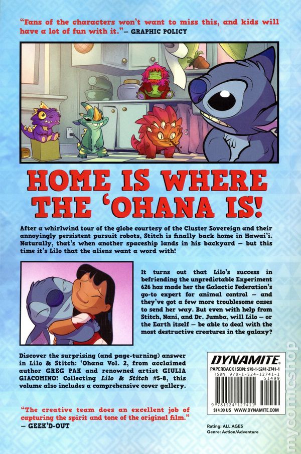 Volume 2 - 1st printing. Collects Lilo and Stitch (2024 Dynamite) #5-8. Written by Greg Pak. Art by Giulia Giacomino. Cover by Nicoletta Baldari. Back Cover by Giulia Giacomino. HOME IS WHERE THE OHANA IS! After a whirlwind tour of the globe courtesy of the Cluster Sovereign and their annoyingly persistent pursuit robots, Stitch is finally back home in Hawaii. Naturally, that's when another spaceship lands in his backyard — but it this time its Lilo that the aliens want a word with! It turns out that Lilo's success in befriending the unpredictable Experiment 626 has made her the Galactic Federations go-to expert for animal control — and they've got a few more troublesome cases to send her way. But even with help from Stitch, Nani, and Dr. Jumba, will Lilo — or the Earth itself — be able to deal with the most destructive creatures in the galaxy? Discover the surprising (and page-turning) answer in Lilo & Stitch: 'Ohana Vol. 2, from acclaimed author GREG PAK and renowned artist GIULIA GIACOMINO! Collecting issues #5-8 of ongoing series, this special 6" x 9" volume also includes a comprehensive cover gallery. Softcover, 6-in. x 9-in., 104 pages, full color. All Ages Cover price $14.99.