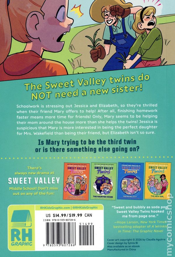 Volume 7 - 1st printing. "Three's a Crowd!" Created by Francine Pascal. Adapted by Nicole Andelfinger. Art and cover by Knack Whittle. The Sweet Valley Twins are no strangers to vying for attention. But when their mom starts focusing on helping a friend, the twins face a tough choice: should they team up against her or make room for someone new in their family? Dive into the fun and drama of this New York Times bestselling graphic novel series! The Sweet Valley Twins have a lot of work to do – between Elizabeth's newspaper articles and Jessica's new celebrity cook book project, there's barely any time for anything else! When their friend Mary decides to help them both the twins are relieved – but Mary seems more determined to help their mom around the house than them with their work! Jessica is suspicious that Mary is more interested in Mrs. Wakefield being her new mom than in actually being friends with her and Elizabeth, but Elizabeth isn't so sure. There has to be a reason why she'd rather be with the Wakefields than at home, right? The exciting seventh entry into the hit graphic novel adaptation of the beloved Sweet Valley spin-off series! Softcover, 6-in. x 8-in., 224 pages, full color. Cover price $14.99.