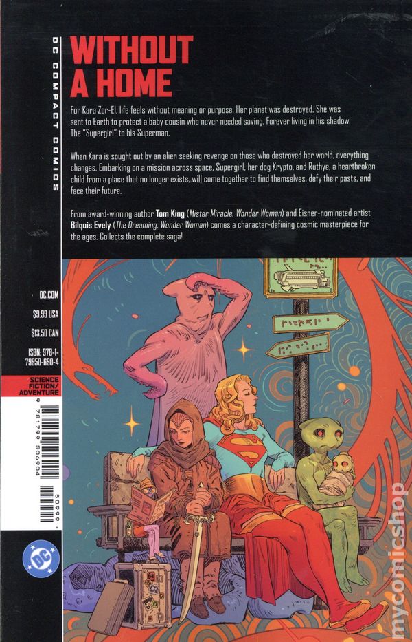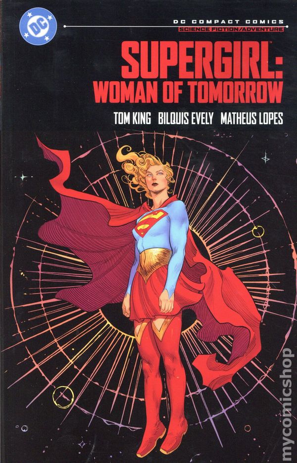 1st printing. Collects Supergirl: Woman of Tomorrow (2021 DC ) #1-8. Written by Tom King. Art and cover by Bilquis Evely. THE AWARD-NOMINATED MASTERPIECE COMES TO COMPACT COMICS! Its Supergirl like you've never seen her before, in a character-defining sci-fi/fantasy masterpiece from Mister Miracle writer Tom King and Wonder Woman artist Bilquis Evely! Kara Zor-El has seen some epic adventures over the years, but she now finds her life without meaning or purpose. Here she is, a young woman who saw her planet destroyed and was sent to Earth to protect a baby cousin who ended up not needing her. Just when Supergirl thinks she's had enough, everything changes. An alien girl seeks her out for a vicious mission. Her world has been destroyed, and the bad guys responsible are still out there. She wants revenge, and if Supergirl doesn't help her, shell do it herself, whatever the cost. Now a Kryptonian, a dog, and an angry, heartbroken child head out into space on a journey that will shake them to their very core. This volume collects the entirety of the eight-issue miniseries SUPERGIRL: WOMAN OF TOMORROW. Softcover, 5 1/2-in. x 8 1/2-in., 216 pages, full color. Teen Cover price $9.99.