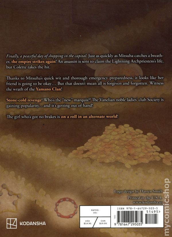 Volume 9 - 1st printing. Written by FUNA. Art and cover by Touzai. Translated by Lukas Ruplys. Can Mitsuha collect 80,000 gold coins so she can live a leisurely retirement!? A fun twist on the isekai genre with elements of transporting between worlds! With an anime adaptation now on Crunchyroll! Finally, a peaceful day of shopping in the capital. Just as quickly as Mitsuha catches a breather, the empire strikes again! An assassin is sent to claim the Lightning Archpriestesss life, but Colette takes the hit. Thanks to Mitsuhas quick wit and thorough emergency preparedness, it looks like her friend is going to be okay… But that doesnt mean all is forgiven and forgotten. Witness the wrath of the Yamano Clan! Stone-cold revenge! Whos the new marquis?! The Vanelian noble ladies club Society is gaining popularity…and its getting out of hand! The girl whos got no brakes is on a roll in an alternate world! Softcover, 5-in. x 7-in., 212 pages, Text (with B&W Chapter Illustrations). Rated 16+ Cover price $14.95.