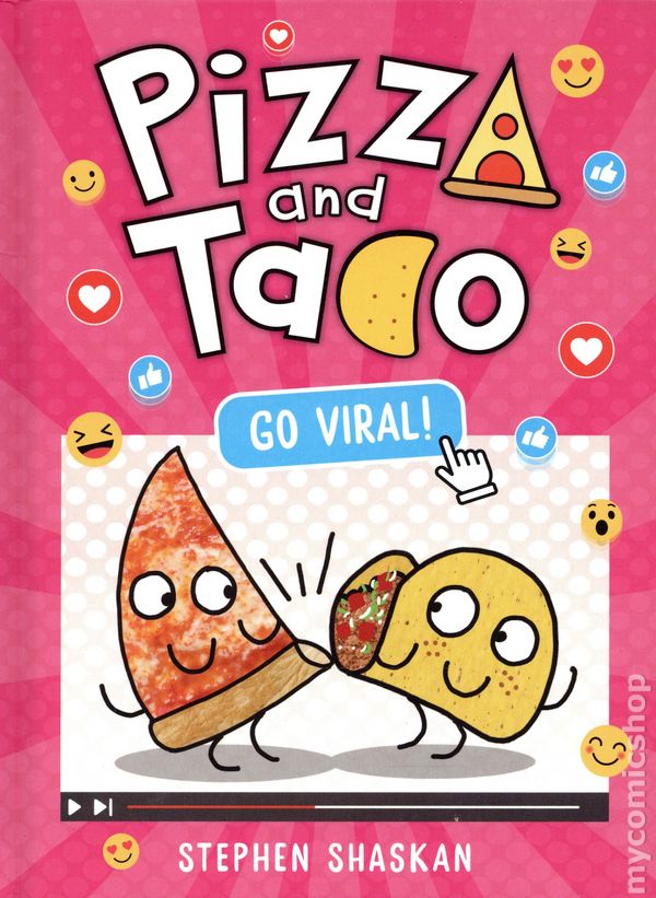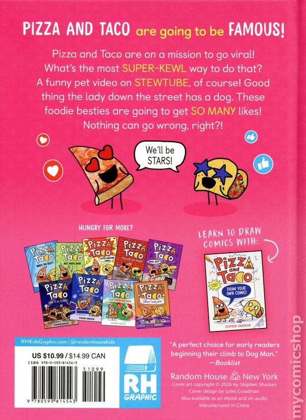 Volume 10 - 1st printing. "Go Viral!" Story and art by Stephen Shaskan. Streaming live on StewTube: Pizza and Taco!!! These foodie besties are on a mission to go viral! Will they get lots of likes for their awesome video? Find out in book #10 in the best-selling chapterbook graphic novel series! Pizza and Taco are "jelly" of their friends who have StewTube channels. But don't worry, these food besties always have a plan! All they need is some funny footage and a pet video is what most people are hungry for. Since neither of them has a pet, they borrow Biscuit the dog from the lady down the street—with some embarrassing results! This hilarious young graphic novel series—with chapters—will tickle the funny bones of kids ages 5-8 and bolster their reading confidence. It's the perfect stepping stone for those who are transitioning to longer chapter books and graphic novels. Hardcover, 5-in. x 8-in., 72 pages, full color. All Ages Cover price $10.99.