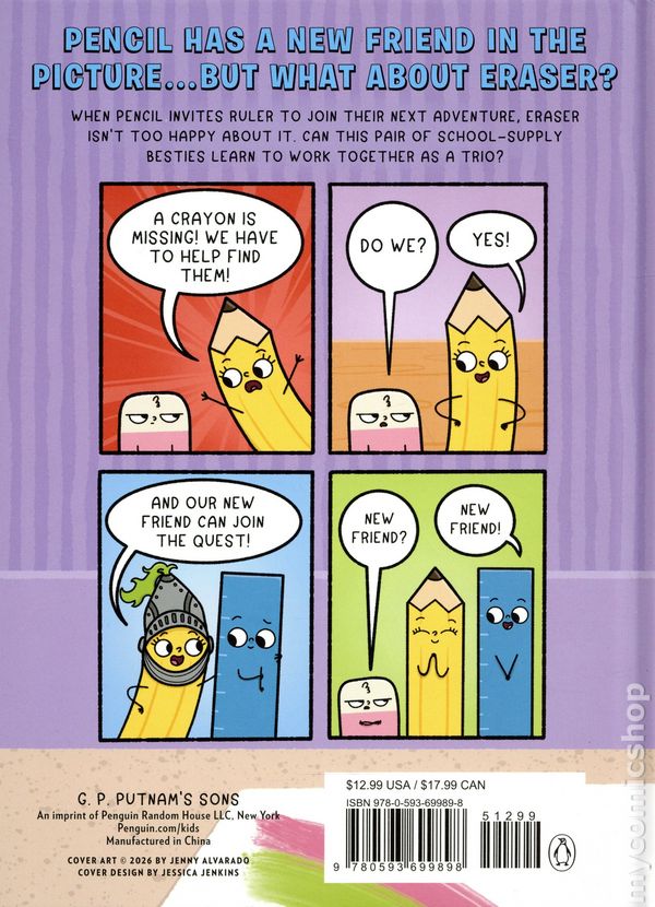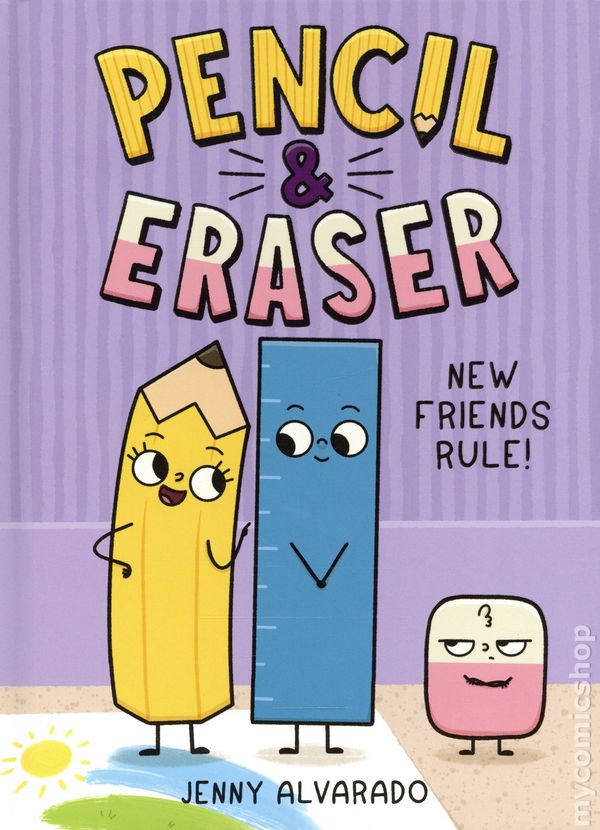 Volume 3 - 1st printing. "New Friends Rule!" Story and art by Jenny Alvarado. In the third book of this hilarious series—perfect for fans of Pizza and Taco—Pencil makes a new friend... and Eraser learns that three can be a crowd. Pencil and Eraser complement each other perfectly, like any best buds should. Who else could help Pencil when she messes up her drawings in art class? But what if she didn't make any mistakes? Enter Ruler, a new friend who can easily help Pencil keep her lines straight, without any need to ever erase again... When these school supplies learn a green crayon has gone missing, Pencil insists her new bud Ruler join their quest to save them. The two hit it off immediately, building off each others wacky ideas. And as the sole voice of reason, Eraser quickly starts to feel like the odd one out. With Stella and the rest of the students due back form lunch any minute, and each of their plans to rescue Green a bigger disaster than the last, can our dynamic duo learn to work as a trio before its too late? Hardcover, 6 1/2-in. x 8 1/2-in., 80 pages, full color. Age 5-8 year Cover price $12.99.