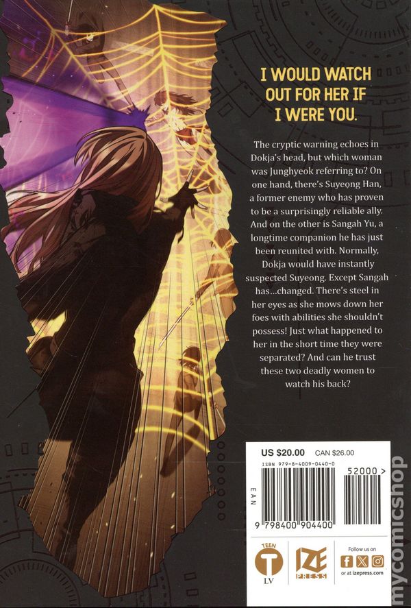 Volume 9 - 1st Printing. Original Story by singNsong. Adapted by Umi (Redice Studio). Art by Sleepy-C (3B2S STUDIO). Translated by Hye Young IM. The mad scramble to save Seoul from a series of disasters continues. Thankfully, Dokja is not alone. In addition to his unlikely alliance with Suyeong, he is reunited one of his companions. However, the person hes known since before the apocalypse seems to have completely changed! Just what could have happened to Sangah during the short time she was separated from Dokja?! Softcover, 5 1/2-in. x 8-in., 240 pages, full color. Teen Cover price $20.00.