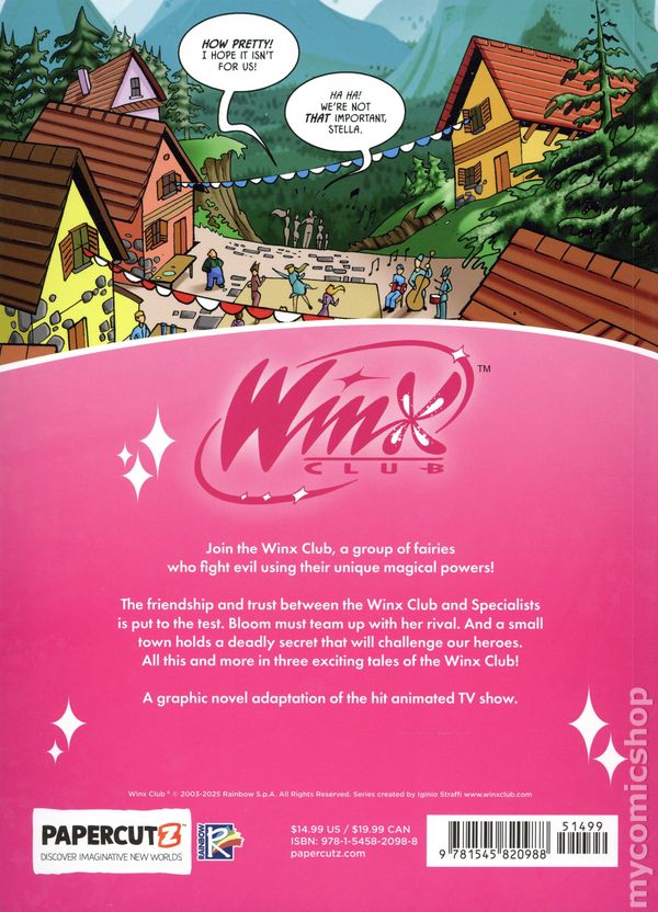 Volume 5 - 1st printing. "Alone Against Everybody!" Story and art by Rainbow S.p.A. The friendship and trust between the Winx Club and Specialists is put to the test. Bloom must team up with her rival. And a small town holds a deadly secret that will challenge our heroes. All this and more in three exciting tales of the Winx Club! Softcover, 6-in. x 9-in., 144 pages, full color. Cover price $14.99.