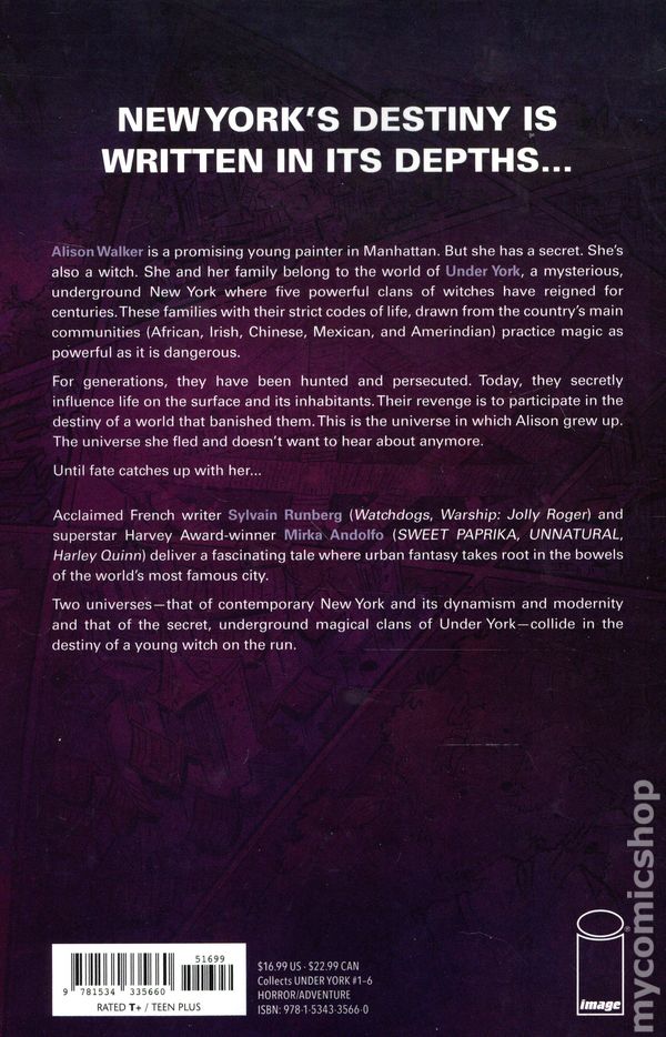 1st printing. Written by Sylvain Runberg. Art and Cover by Mirka Andolfo. New York's destiny is written in its depths… Alison Walker is a promising young painter in Manhattan. But she has a secret. She's also a witch. She and her family belong to the world of Under York, a mysterious, underground New York where five powerful clans of witches have reigned for centuries. These families with their strict codes of life, drawn from the country's main communities (African, Irish, Chinese, Mexican, and Amerindian) practice magic as powerful as it is dangerous. For generations, they have been hunted and persecuted. Today, they secretly influence life on the surface and its inhabitants. Their revenge is to participate in the destiny of a world that banished them. This is the universe in which Alison Walker grew up. The universe she fled and doesn't want to hear about anymore. Until fate catches up with her... Acclaimed French writer SYLVAIN RUNBERG (_Watchdogs, Warship: Jolly Roge_r) and superstar Harvey Award winner MIRKA ANDOLFO deliver a fascinating tale where urban fantasy takes root in the bowels of the world's most famous city. Two universes- that of contemporary New York and its dynamism and modernity and that of the secret, underground magical clans of Under York- collide in the destiny of a young witch on the run. Softcover, 160 pages, full color. Teen+ Cover price $16.99.