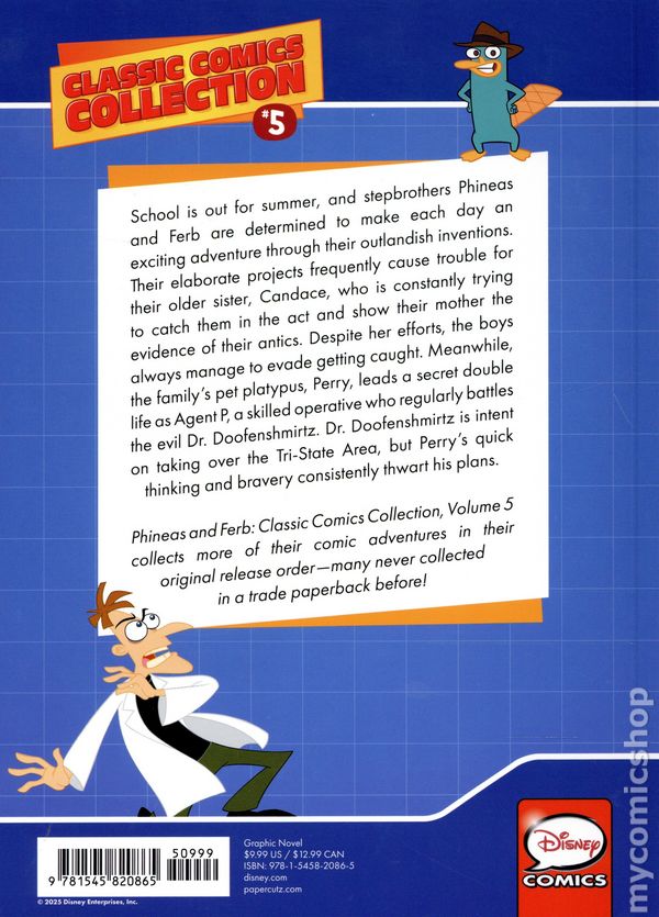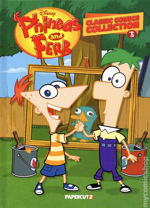 Volume 5 - 1st printing. Written by Scott Peterson. Art by Bill Alger, Mike DeCarlo, Fabricio Grellet, Magic Eye Studios, Mike Morris, Tom Neely, Scott Neely, Tanner Wiley, Min Sung Ku, and Anthony Vukojevich. School is out for summer, and stepbrothers Phineas and Ferb are determined to make each day an exciting adventure through their outlandish inventions. Their elaborate projects frequently cause trouble for their older sister, Candace, who is constantly trying to catch them in the act and show their mother the evidence of their antics. Despite her efforts, the boys always manage to evade getting caught. Meanwhile, the familys pet platypus, Perry, leads a secret double life as Agent P, a skilled operative who regularly battles the evil Dr. Doofenshmirtz. Dr. Doofenshmirtz is intent on taking over the Tri-State Area, but Perrys quick thinking and bravery consistently thwart his plans.Phineas and Ferb: Classic Comics Collection, Volume 5 collects more of their comic adventures in their original release order--many never collected in a trade paperback before! Hardcover, 96 pages, full color. Cover price $14.99.
