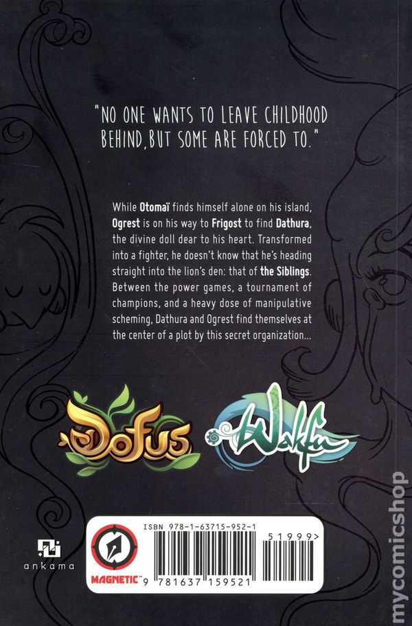 Volume 3 - 1st printing. Story and art by Mig. Set within the video-game universe of Wakfu, the popular online role-playing game and animated series on Netflix! While the alchemist wizard Otomai waits alone on his island . . . Ogrest is on his way to Harebourgs Castle to find Dathura, the divine doll he loves so dearly. Transformed into a fighter, he doesnt know that hes heading straight for trouble in the form of the Brotherhood. Dathura and Ogrest find themselves in the center of this secret organizations plot! Softcover, 6-in. x 9-in., 240 pages, B&W. Teen+ Cover price $19.99.