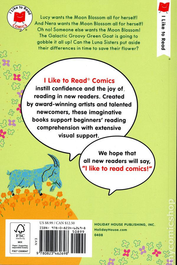1st printing. Story and art by Dan Yaccarino. Lucy and Nera are opposites BUT . . . they both want the Moon Blossom! Created by an award-winning author-illustrator, this funny comic is perfect for first- and second-grade readers. Lucy releases her flippity flappy butterflies, a thunderstorm, and her polka dotted elephant. And Nera counters with a grabby claw and a robotic tarantula. But while theyre squabbling, a Galactic Green Goat is about to gobble up their Moon Flower. The sisters must come together to outwit the goat and rescue their blossom. You will also like The Luna Sisters and their Amazing Luna Fish! I Like to Read Comics are perfect for kids who are challenged by or unengaged in reading, kids who love art, and the growing number of young comics fans. Filled with eye-catching art, humor, and terrific stories, these comics provide unique reading experiences for growing minds. Softcover, 6-in. x 9-in., 40 pages, full color. Age 4-8 years Cover price $8.99.
