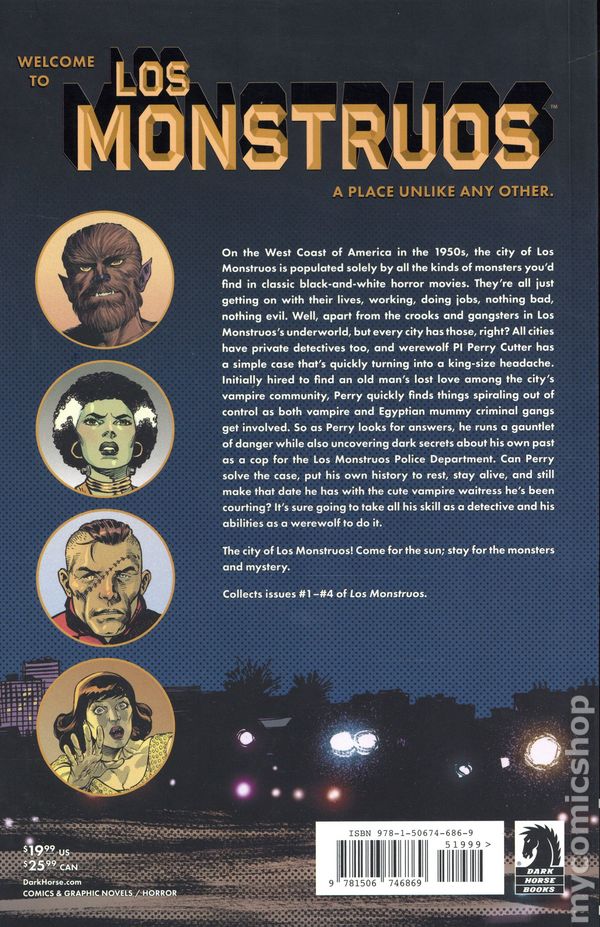 1st printing. Collects Los Monstruos (2025 Dark Horse) #1-4. Written by James Robinson. Art and cover by Jesus Merino. From the celebrated creator behind Starman comes this new monster-filled mystery noir. Monsters, mobsters, and mystery…all in one city! Its a city like any other, filled with citizens living and working side-by-side, except…everyone here is a monster! Welcome to LOS MONSTRUOS, a place unlike any other. The city of Los Monstrous, located on the West Coast of America in the 1950s, is populated solely by monsters of all the kinds youd find in classic black and white horror movies. Theyre all just getting on with their lives, working, doing jobs, nothing bad, nothing evil. Well apart from the crooks and gangsters in Los Monstruoss underworld, but every city has those, right? All cities have private detectives too, and werewolf P.I. Perry Cutter has a simple case thats quickly turning into a king-size headache. Initially hired to find an old mans lost love from among the citys vampire community, Perry quickly finds things spiraling out of control as both vampire and Egyptian mummy criminal gangs get involved. So as Perry looks for answers, he runs a gauntlet of danger, while also uncovering dark secrets about his own past as a cop for the Los Monstruos Police Department. Can Perry solve the case, put his own history to rest, stay alive, and still make that date he has with the cute vampire waitress hes been courting? It sure going to take all his skill as a detective and his abilities as a werewolf to do it. The city of Los Monstruos! Come for the sun, stay for the monsters and mystery. Softcover, 120 pages, full color. Rated T Cover price $19.99.