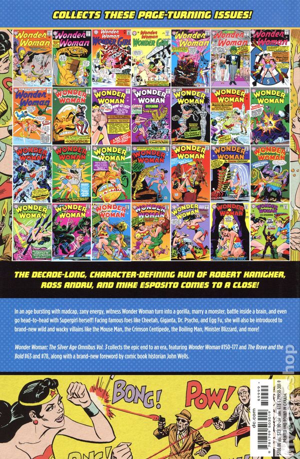 Volume 3 - 1st printing. Collects Wonder Woman (1942-1986 1st Series DC) #150-177 and The Brave and the Bold (1955-1983 1st Series DC) #63 and 78. Written by Robert Kanigher, Bob Haney, and Bill Finger. Art by Ross Andru, Irv Novick, Ric Estrada, Win Mortimer, John Rosenberger, Bob Brown, Mike Esposito, and Jack Abel. Cover by Ross Andru and Mike Esposito. Introduction by John Wells. OVER TWO DOZEN ADVENTURES, NEVER BEFORE COLLECTED IN COLOR! Return to Paradise Island! This transformative era sees Dianas origins rewritten, her Wonder Family expanded, and classic villains revived in wild, imaginative tales by Robert Kanigher, Ross Andru, and Mike Esposito. Packed with iconic stories and creative reinventions, this volume captures a pivotal, unpredictable chapter in the Amazing Amazons incredible history. Hardcover, 8 1/2-in. x 11-in., 760 pages, full color. All Ages Cover price $100.00.