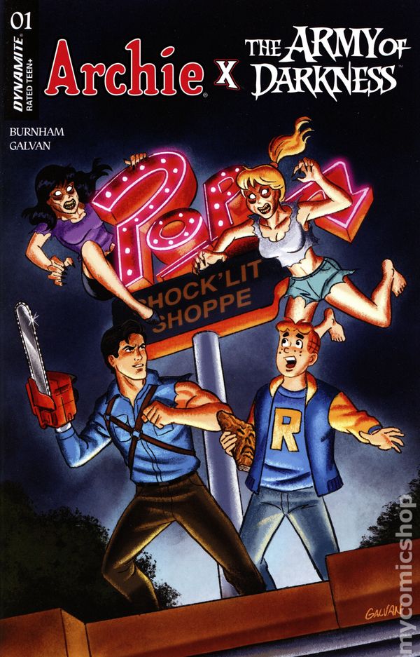 Limited 1 for 10 Retailer Incentive Variant Cover. (W) Erik Burnham (A) Bill Galvan (CA) Bill Galvan ITS A TEENAGE NIGHTMARE! Theres a certain man — names Ash, you may have heard of him — who is doomed to battle against the forces of evil, over and over again, whether he likes it or not. No matter where he goes, the cycle of violence always repeats itself — until the day that he arrives in the picturesque town of Riverdale. This supernaturally wholesome community seems to break the curse that has plagued Ash ever since he first encountered its otherworldly evil all those years ago. Or rather, the curse was broken — until an over-curious teenager named Archie finds a copy of the Necronomicon Ex Mortis and reads a portion of it aloud, summoning the horrifying Deadites once again! Now Ash and the good townsfolk of Riverdale must hold back the undead hordes long enough for Archie to undo what hes unwittingly done. Otherwise, an Army of Darkness will roll over Riverdale and destroy everything and everyone in its path — and thats just not going to happen on Ashley J. Williamss watch! Fresh-faced author ERIC BURNHAM (Teenage Mutant Ninja Turtles, Ghost Busters) joins wide-eyed artist BILL GALVAN (Archie, Guardians of the Galaxy) for a long nights journey into mayhem with Archie X Army of Darkness #1! Featuring clean-cut covers from GALVAN, ROBERT HACK, LAURA BRAGA, CRAIG CERMAK, and STUART SAYGER, this premier issue also boasts a special PREMIUM MYSTERY BLIND BAG that contains three limited editions of the issue selected randomly from a range of variant covers exclusive to this offering — including two original covers by GALVAN and FRANCESCO FRANCAVILLA, as well as multiple line art variants and colored blanks. Please Note: The number of Blind Bags is limited, and allocations may occur. 32 pages, full color, rated T+. Cover price $4.99.