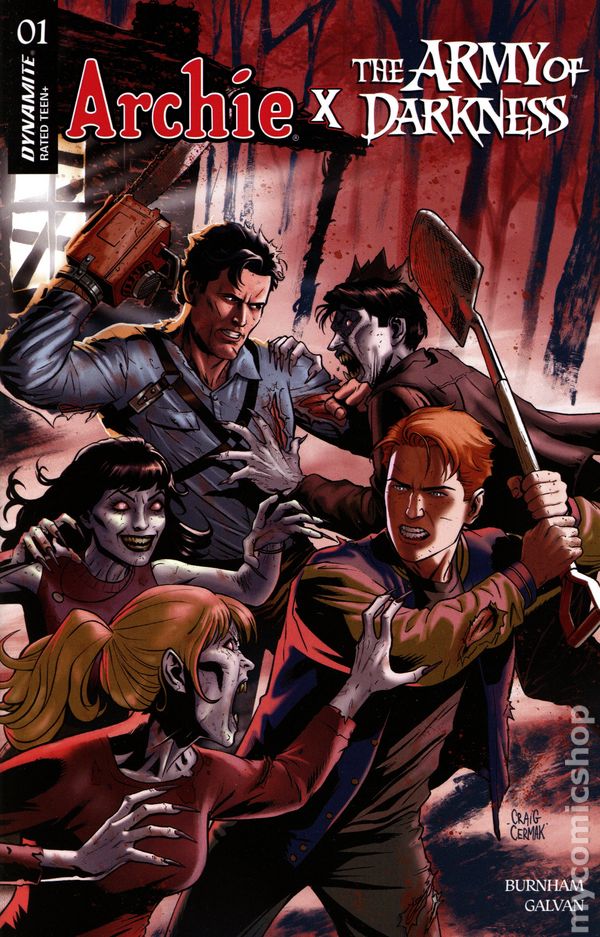 Limited 1 for 15 Retailer Incentive Variant Cover. (W) Erik Burnham (A) Bill Galvan (CA) Craig Cermak ITS A TEENAGE NIGHTMARE! Theres a certain man — names Ash, you may have heard of him — who is doomed to battle against the forces of evil, over and over again, whether he likes it or not. No matter where he goes, the cycle of violence always repeats itself — until the day that he arrives in the picturesque town of Riverdale. This supernaturally wholesome community seems to break the curse that has plagued Ash ever since he first encountered its otherworldly evil all those years ago. Or rather, the curse was broken — until an over-curious teenager named Archie finds a copy of the Necronomicon Ex Mortis and reads a portion of it aloud, summoning the horrifying Deadites once again! Now Ash and the good townsfolk of Riverdale must hold back the undead hordes long enough for Archie to undo what hes unwittingly done. Otherwise, an Army of Darkness will roll over Riverdale and destroy everything and everyone in its path — and thats just not going to happen on Ashley J. Williamss watch! Fresh-faced author ERIC BURNHAM (Teenage Mutant Ninja Turtles, Ghost Busters) joins wide-eyed artist BILL GALVAN (Archie, Guardians of the Galaxy) for a long nights journey into mayhem with Archie X Army of Darkness #1! Featuring clean-cut covers from GALVAN, ROBERT HACK, LAURA BRAGA, CRAIG CERMAK, and STUART SAYGER, this premier issue also boasts a special PREMIUM MYSTERY BLIND BAG that contains three limited editions of the issue selected randomly from a range of variant covers exclusive to this offering — including two original covers by GALVAN and FRANCESCO FRANCAVILLA, as well as multiple line art variants and colored blanks. Please Note: The number of Blind Bags is limited, and allocations may occur. 32 pages, full color, rated T+. Cover price $4.99.