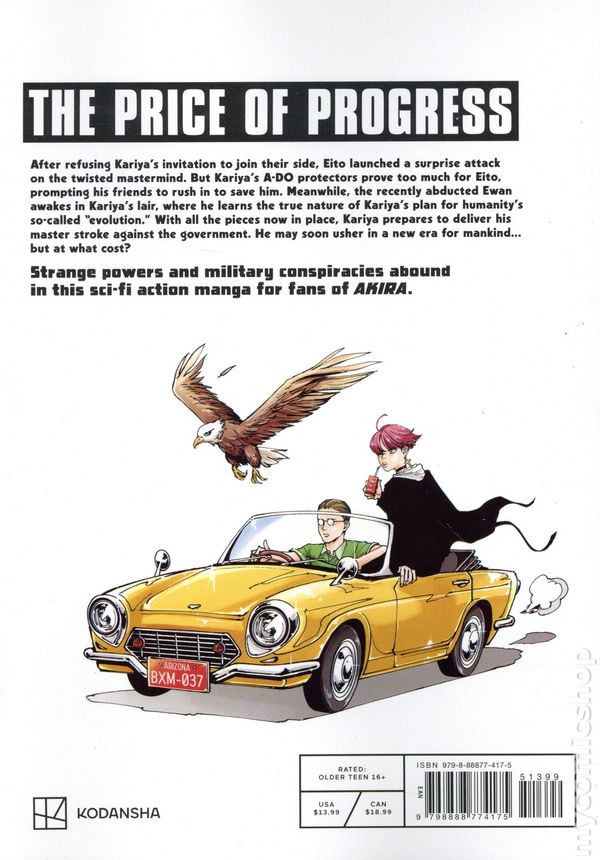 Volume 9 - 1st printing. Story and art by Amano Jaku. Translated by Irene Nakano. A brash young woman and a boy with a mysterious arm search for answers while evading military assassins in this dystopian sci-fi action manga, perfect for fans of Akira and Sakamoto Days. THE PRICE OF PROGRESS. After refusing Kariyas invitation to join their side, Eito launched a surprise attack on the twisted mastermind. But Kariyas A-DO protectors prove too much for Eito, prompting his friends to rush in to save him. Meanwhile, the recently abducted Ewan awakes in Kariyas lair, where he learns the true nature of his plan for humanitys so-called evolution. With all his pieces now in place, Kariya prepares to deliver his master stroke against the government. He may soon usher in a new era for mankind...but at what cost? Softcover, 5-in. x 7-in., 176 pages, B&W. Older Teen (16+) Cover price $13.99.
